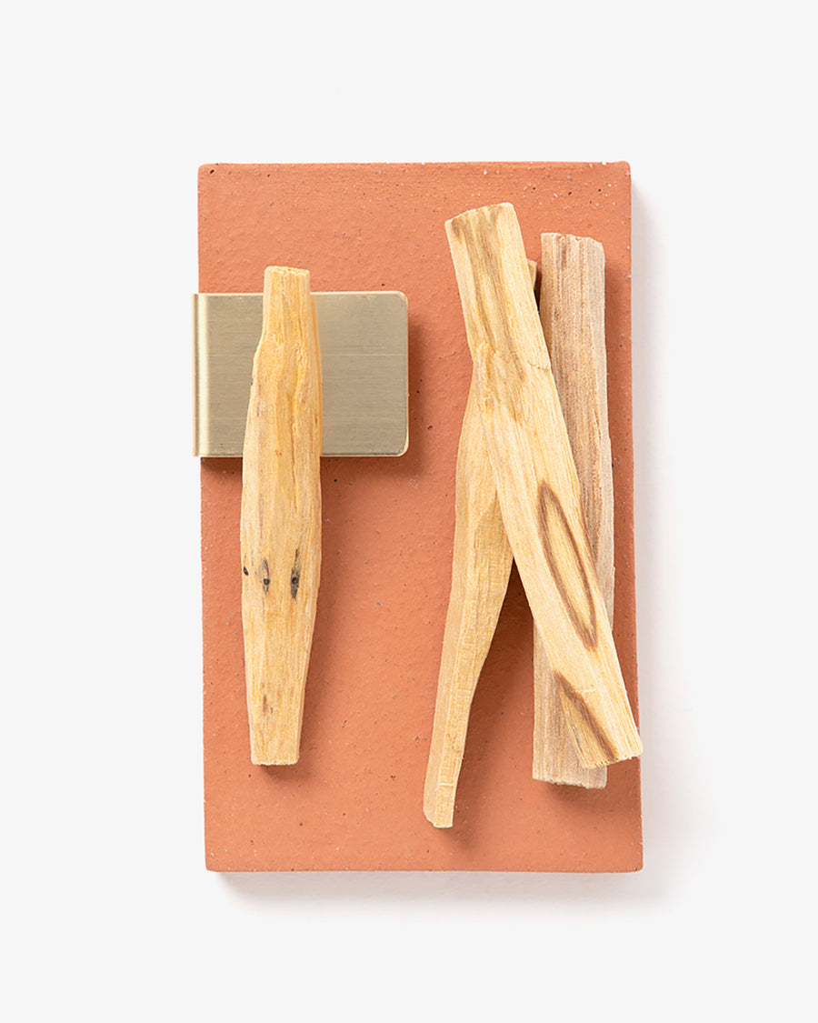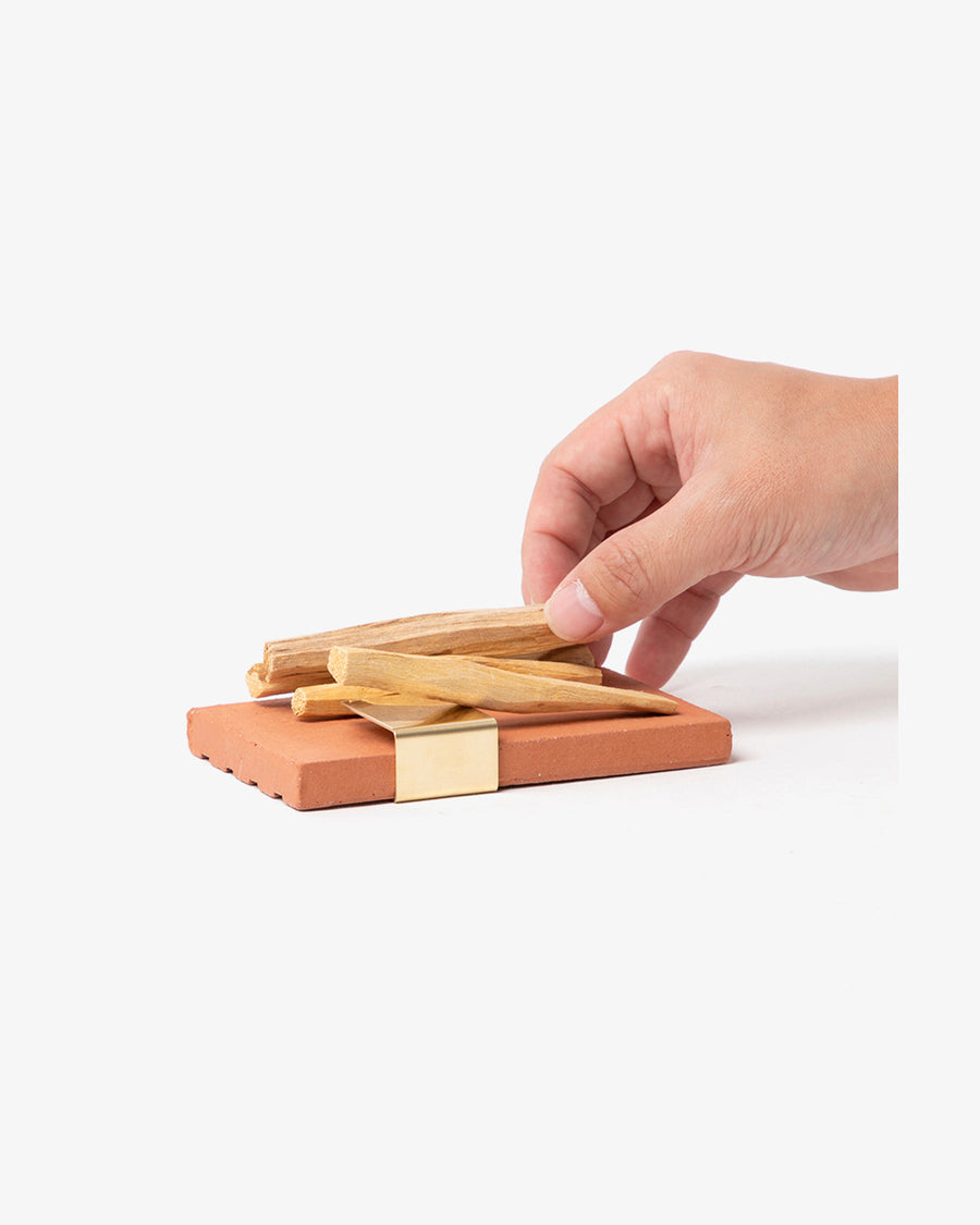 This terracotta incense plate is designed to be used with WHOLE TREE's Palo Santo. The paired back design of the plate highlights the Palo Santo's natural form. The plate is finished with a detachable brass stand to hold the Palo Santo while it is burning