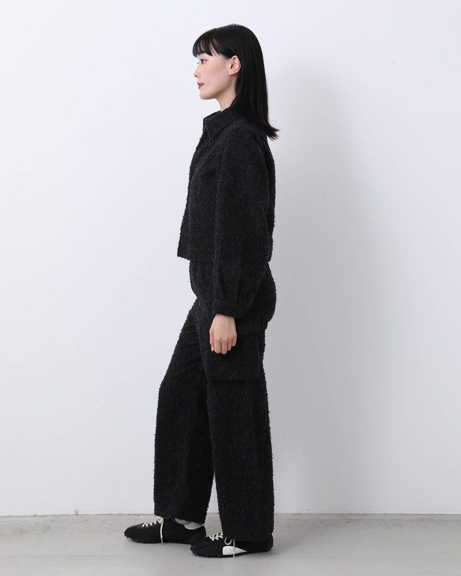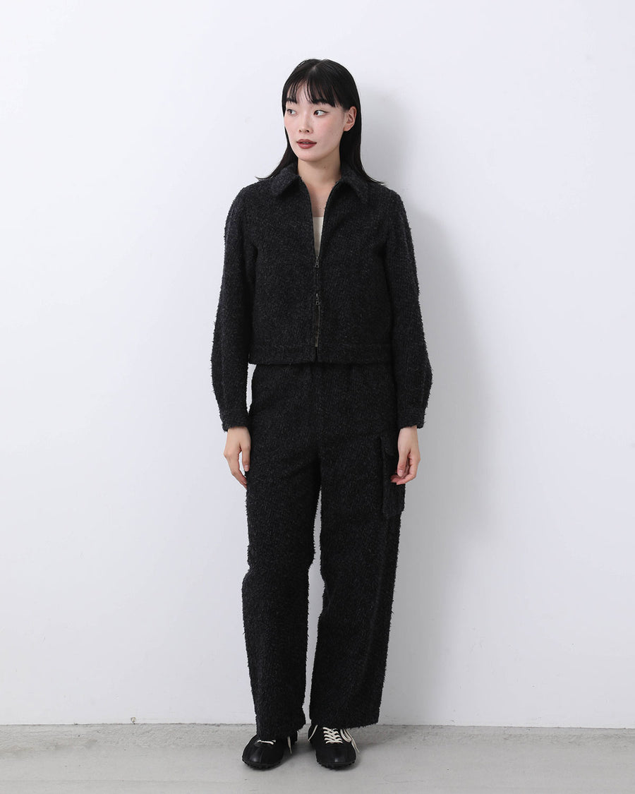 表地にウールを使用し、細かくカットした後に洗いをかけることでウールを縮め、不揃いで独特な表面感を生み出したイージートラウザーです。