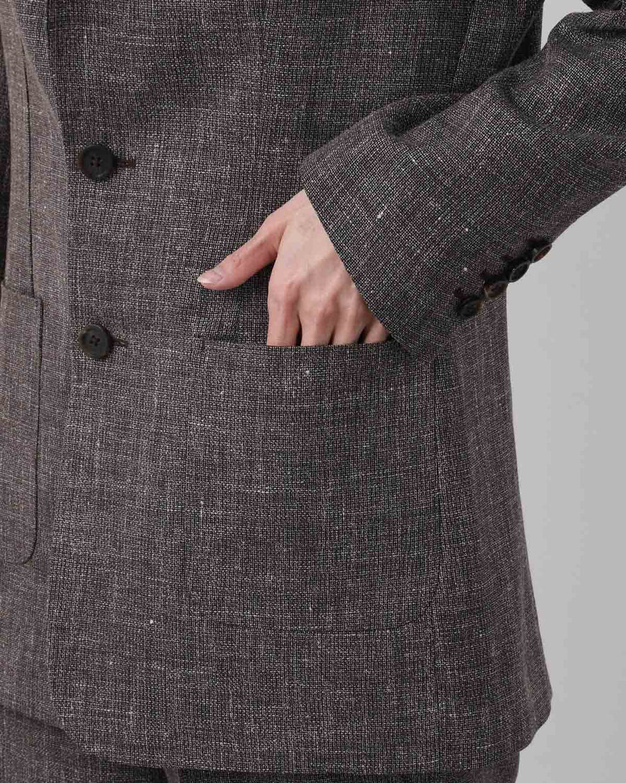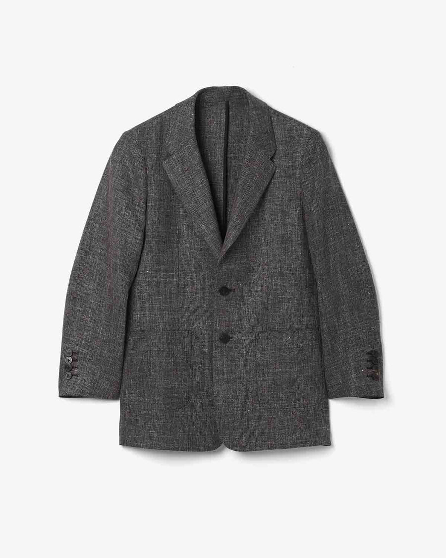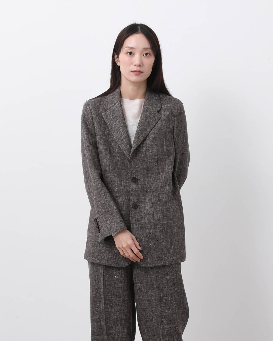 ウールの色のチラつきとフレンチリネンの自然な表情が重なり合う混紡生地を使用し、袖裏のみの一枚仕立てで軽やかに仕上げた、パッチポケット付きのラフな2Bデザインが特徴です。