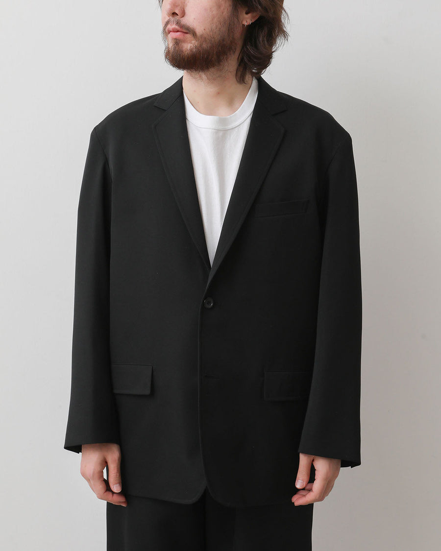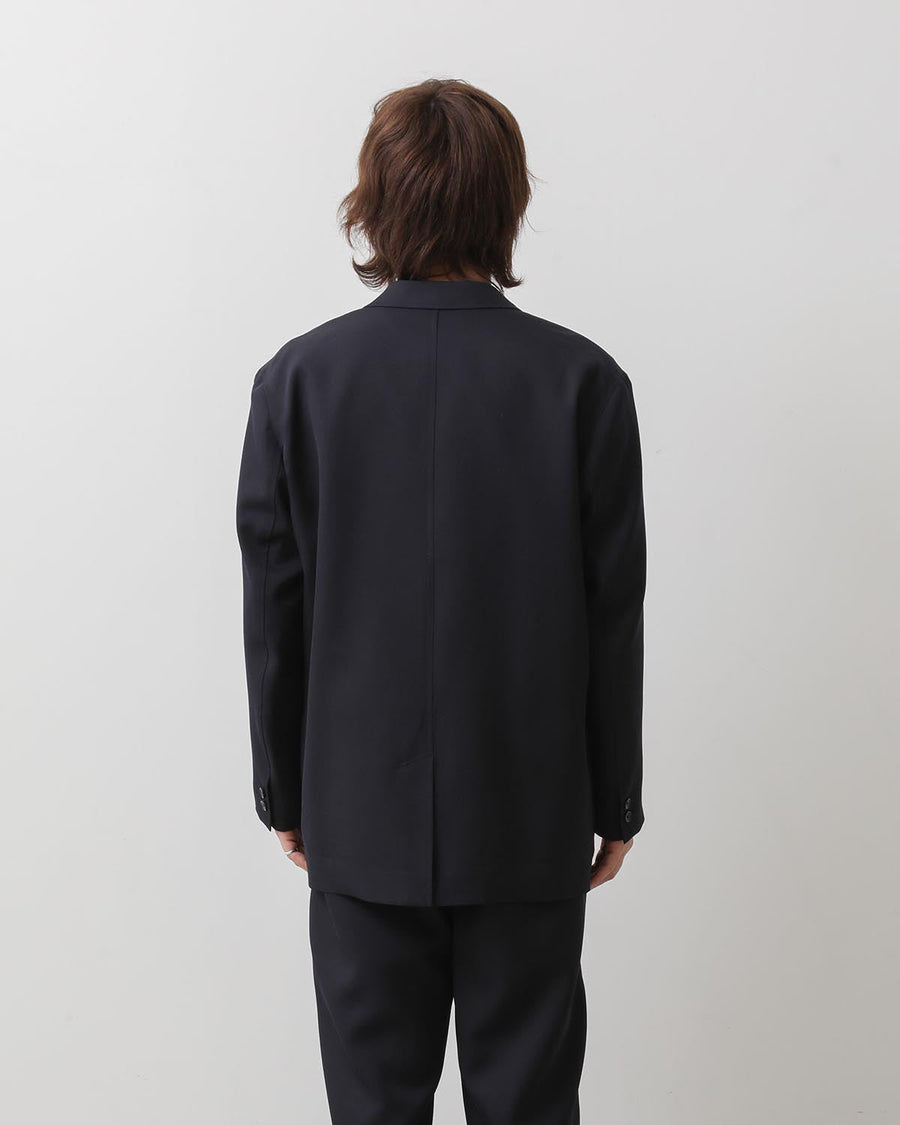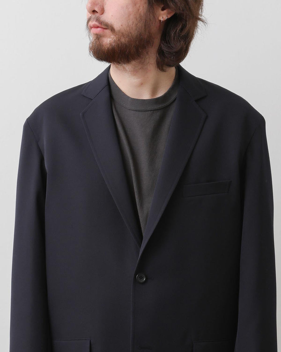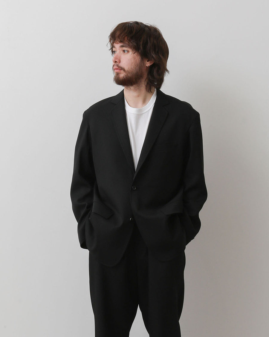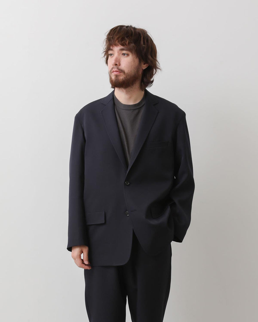 上品なドレープと綺麗な綾目が特徴の高密度ウールギャバジン生地に、特殊な樹脂をウール繊維の内部まで染み込ませることでフィラメントのような光沢とクリアな質感を表現したラペルジャケットです。