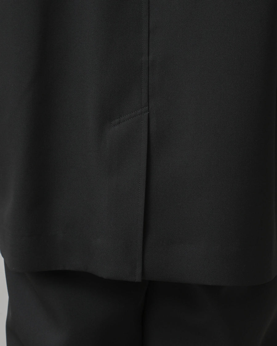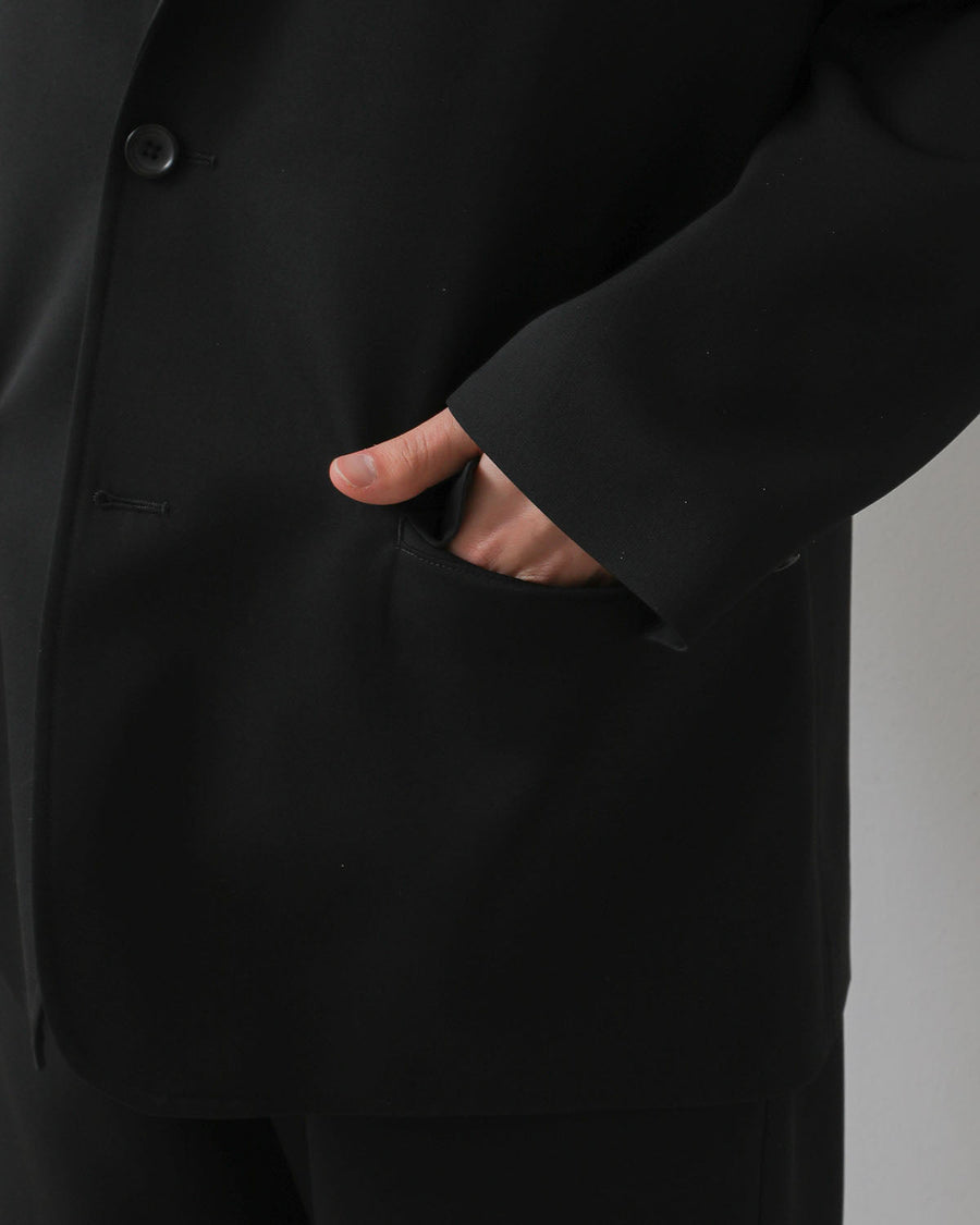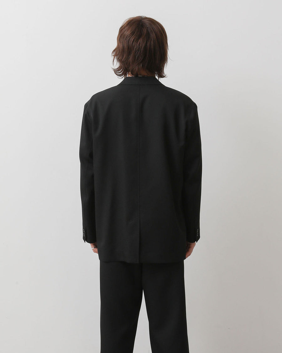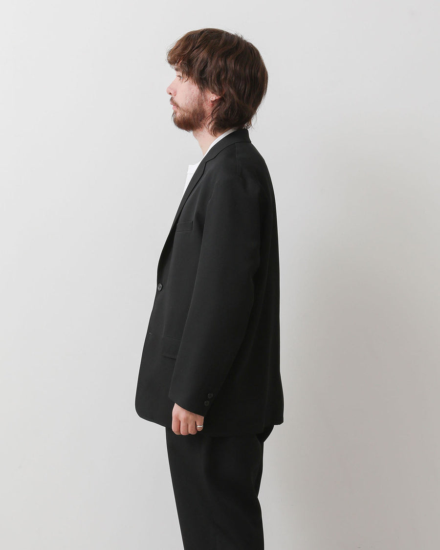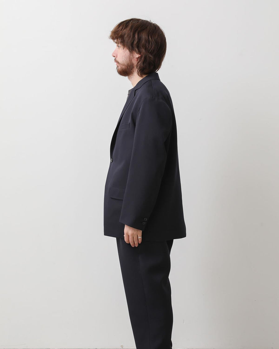 上品なドレープと綺麗な綾目が特徴の高密度ウールギャバジン生地に、特殊な樹脂をウール繊維の内部まで染み込ませることでフィラメントのような光沢とクリアな質感を表現したラペルジャケットです。