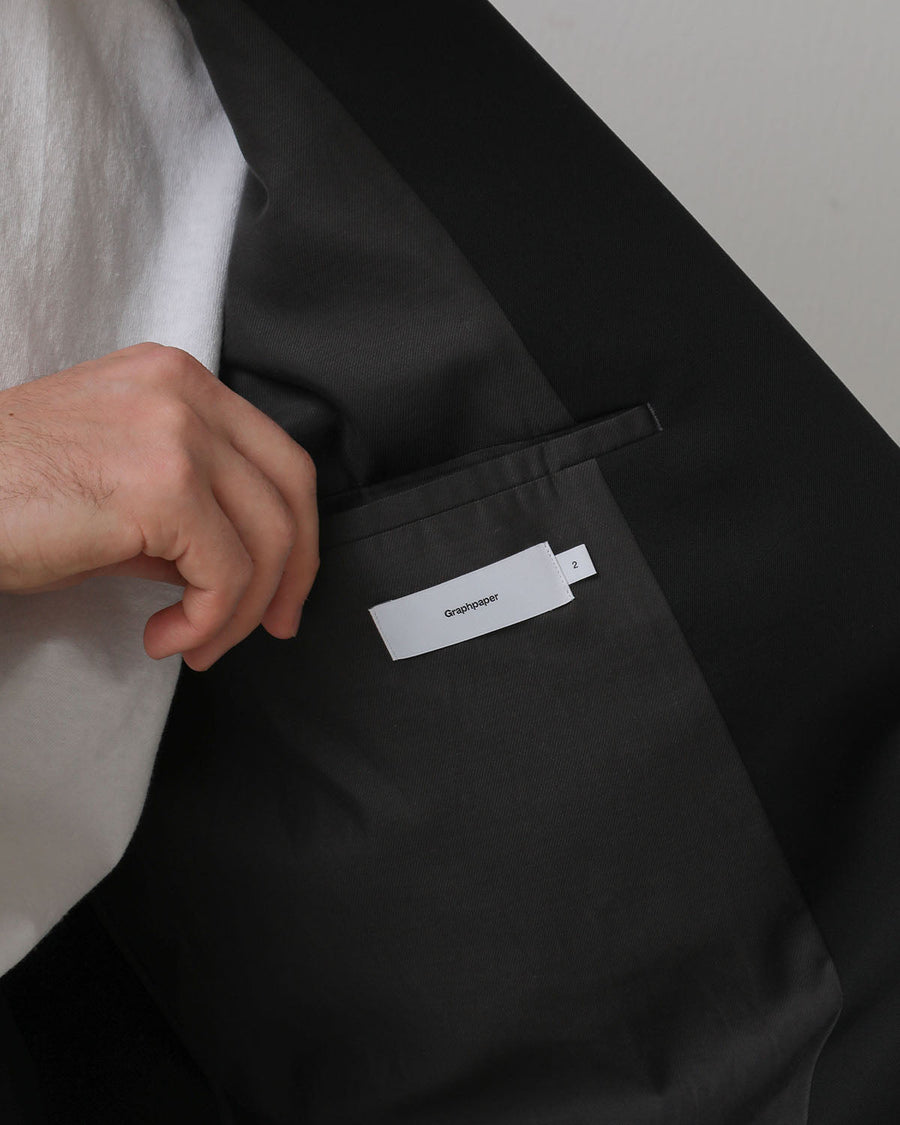 シルエットはウエストシェイプの無いボックスで毛芯仕立ての2Bジャケットをベースに〈Graphpaper〉らしい上質な素材でアレンジを加えています。
