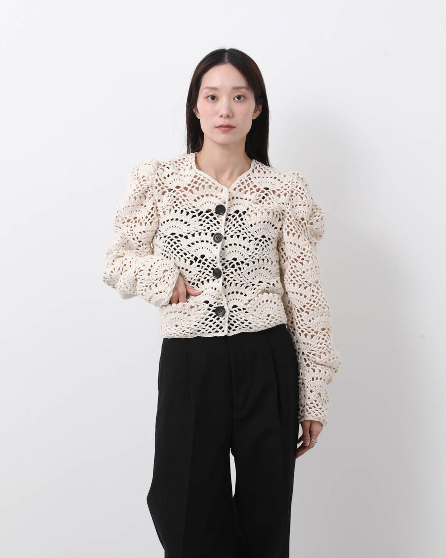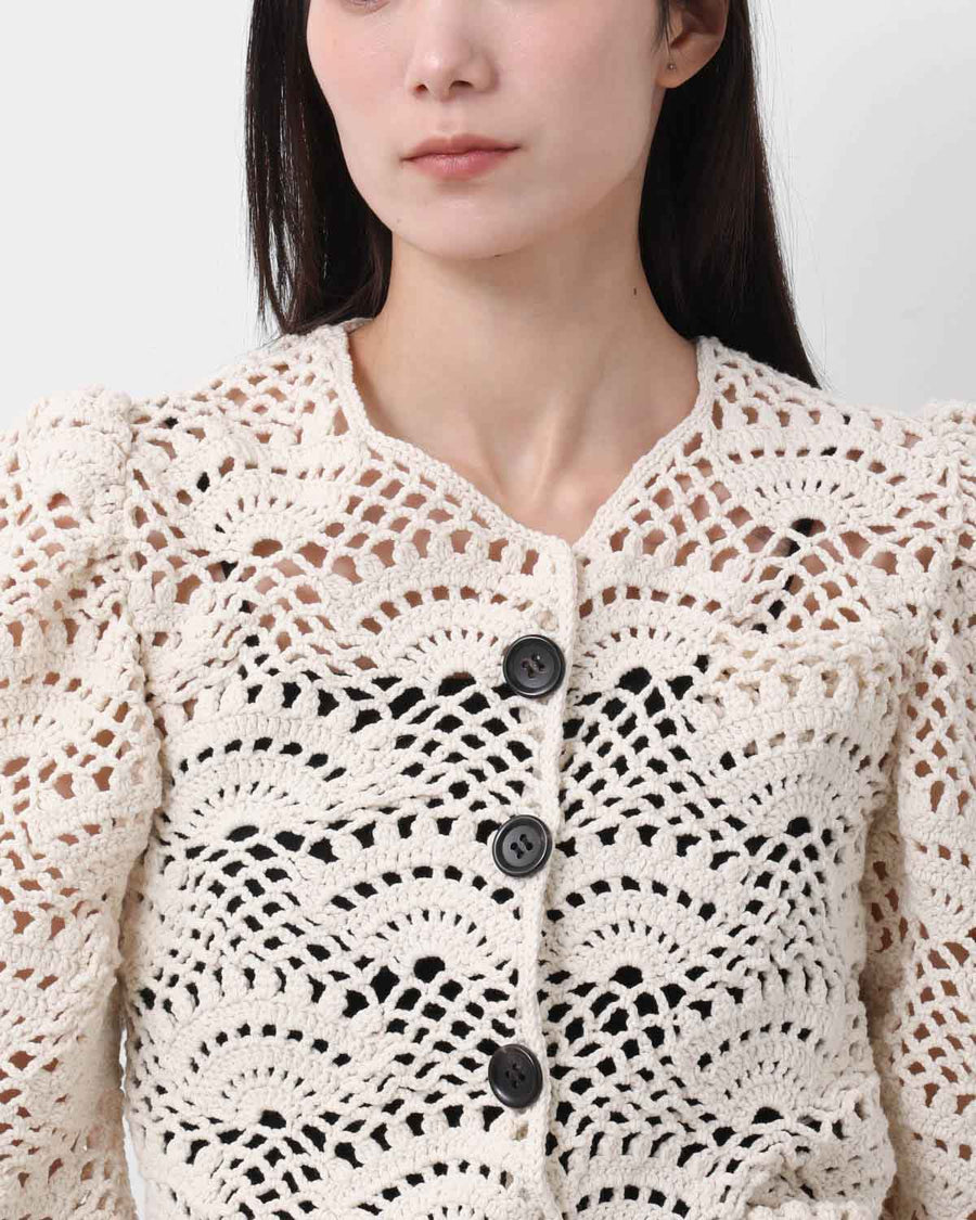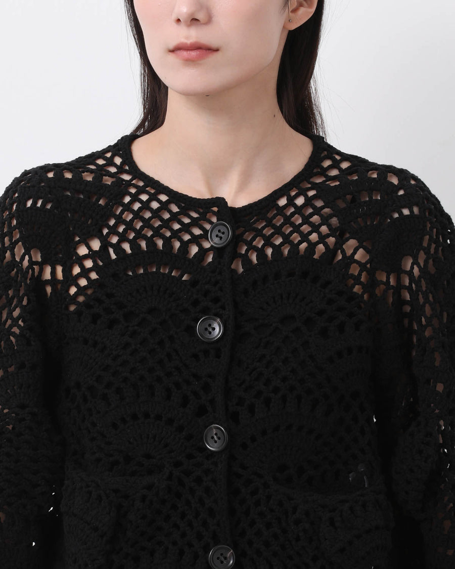 歪に編み上げたレース模様が印象的な、ハンドメイドのクロシェカーディガンです。