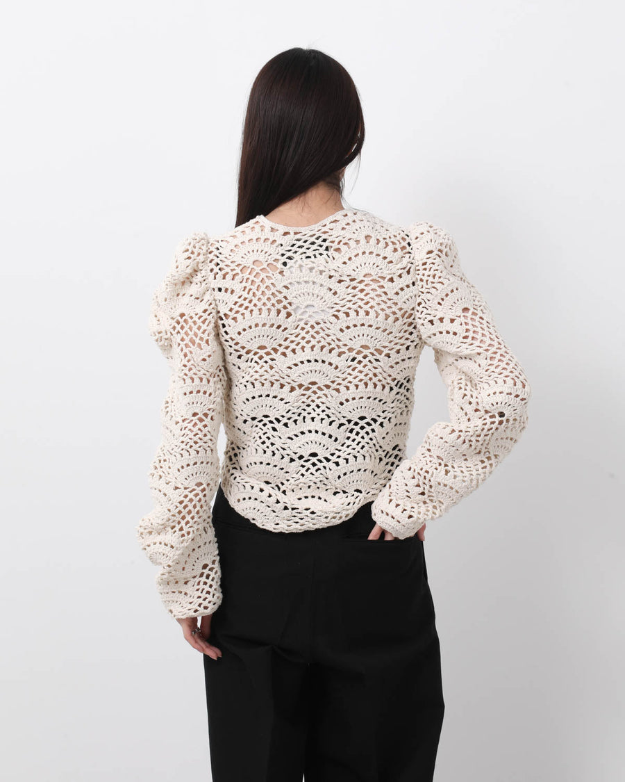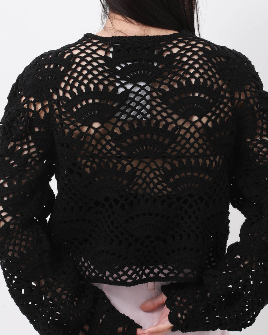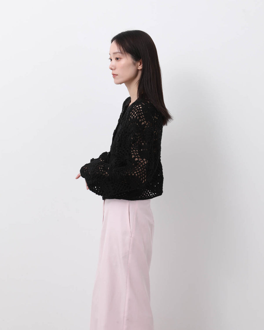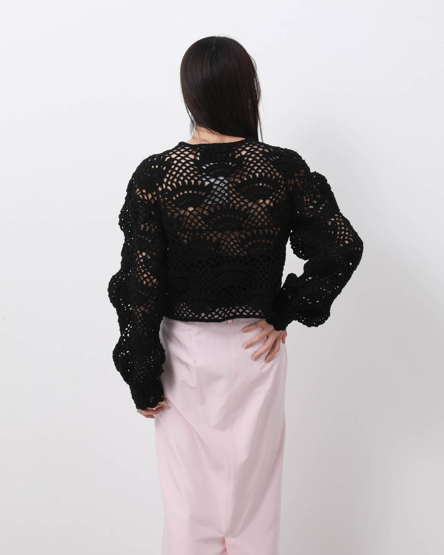 歪に編み上げたレース模様が印象的な、ハンドメイドのクロシェカーディガンです。