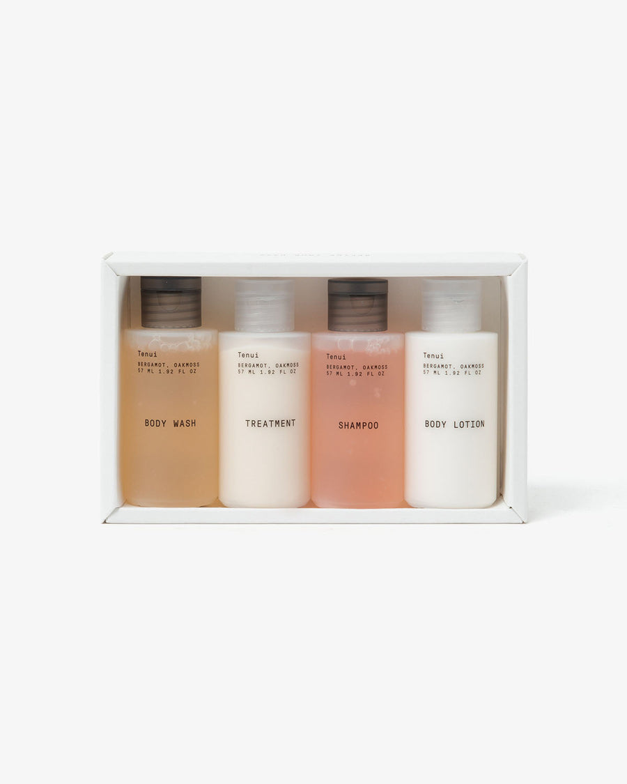 シャンプー、トリートメント、ボディウォッシュ、ボディローションで構成されたトラベルキットです。