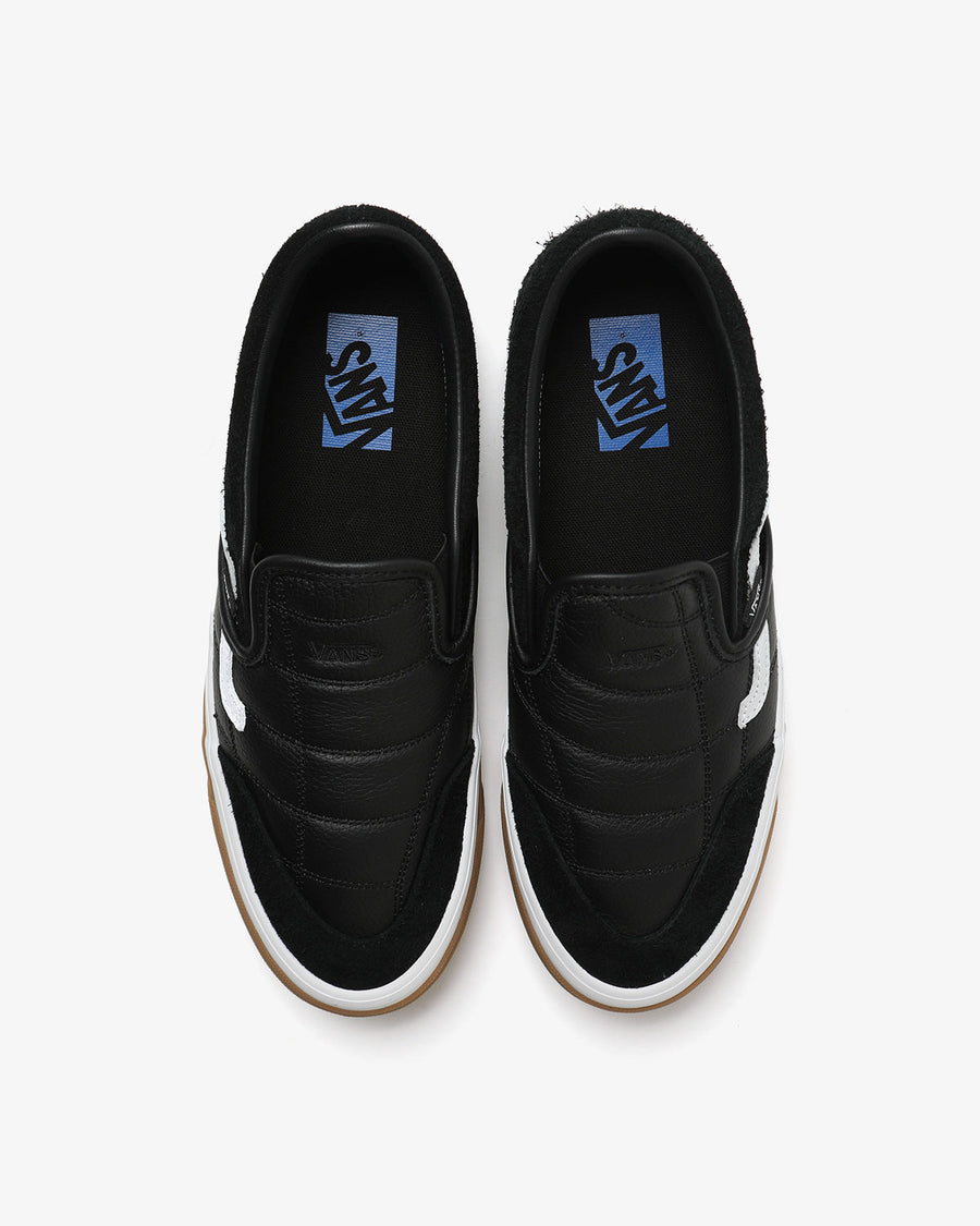 〈VANS〉のクラシックモデル「LX CLASSIC SLIP-ON 98」をベースに、サイドストライプとスエード素材のハーフムーンをプラスして新鮮なアレンジを加えています。