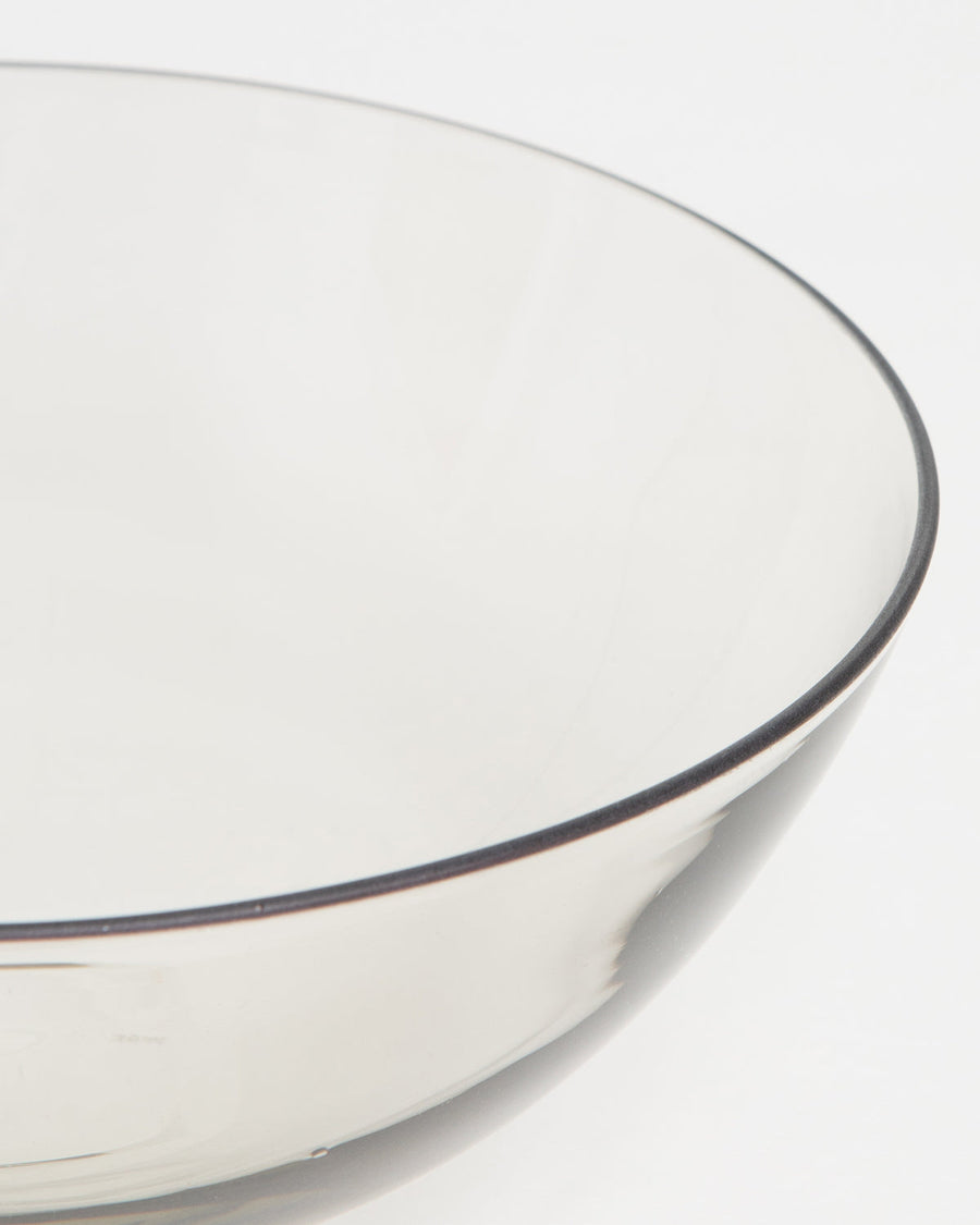 縁には黒のマットガラスを施し、灰色のガラスを全体に少量混ぜ込むことで素朴なグレーの色味を呈しています。