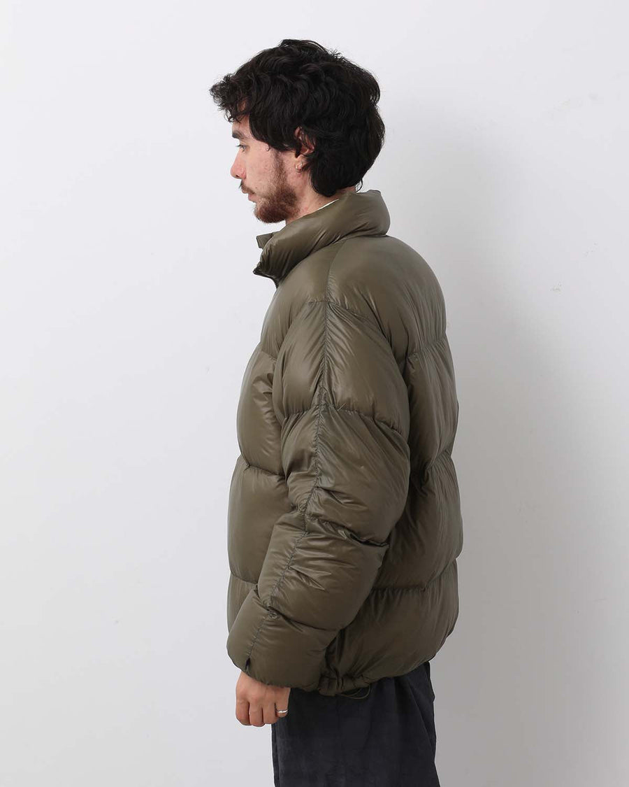 超軽量をテーマに作成されており、中綿がほんのり透けて見えるほどの極薄素材を使用し、ミニマルなスタンドカラーデザインが洗練された印象を与えます。