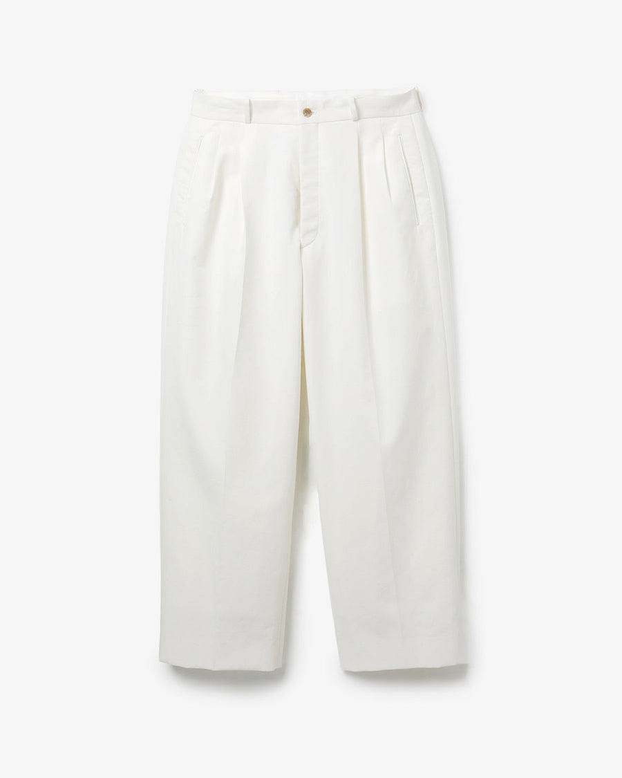 細番手のスーピマコットンを使用し、二重織の一種で”風通織”という特殊な織り方を起用した生地の「WIDE CHINO TROUSERS」です。