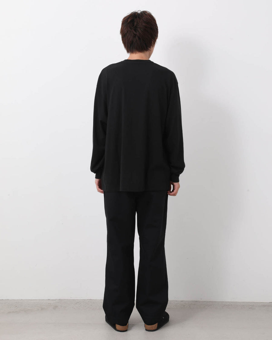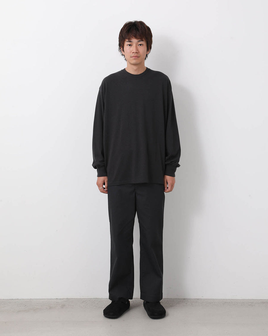 T/C(コットン50% / ポリエステル50%)の糸を使用し、強撚した双糸で高密度に織ることで、シャリっとしたドライタッチな風合いに仕上げたチノトラウザーです。