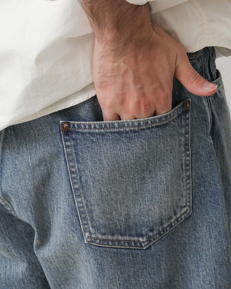股上を僅かに深く設定し、尻ぐりのくい込みを軽減することでバックスタイルを調整。 BIG INCHのデニムで稀に見られる、バックポケットが脇側に離れて配置されたバランスを活かし、完成度の高いデザインの中にさりげない遊びを取り入れています。