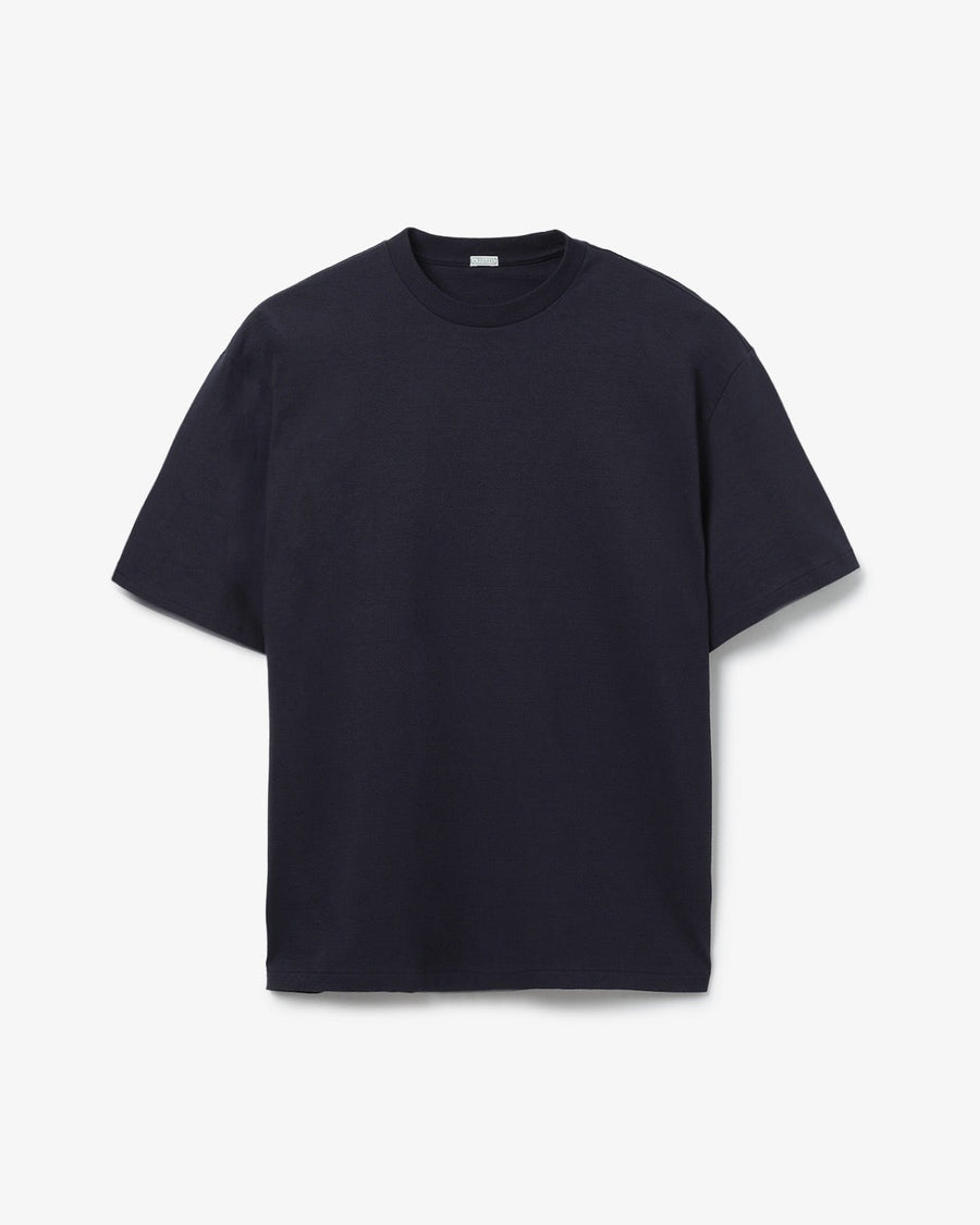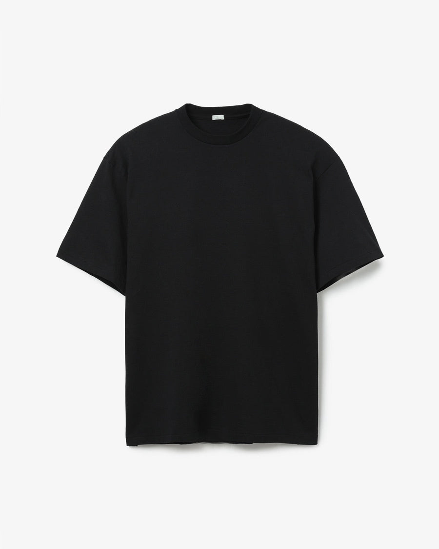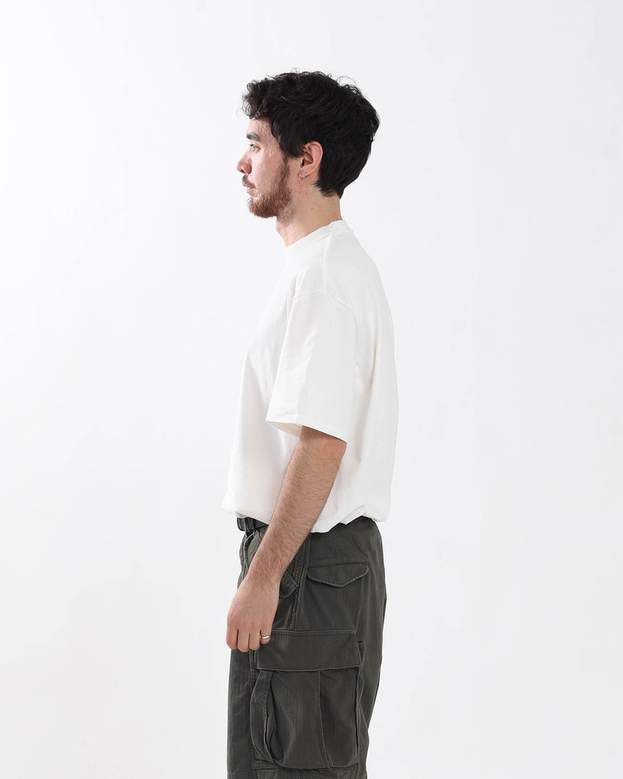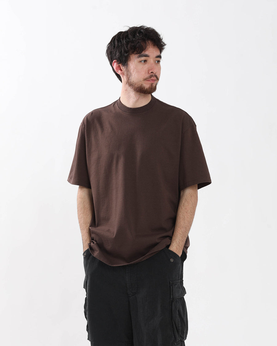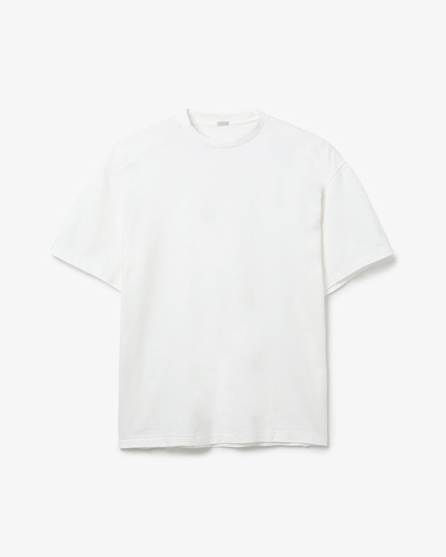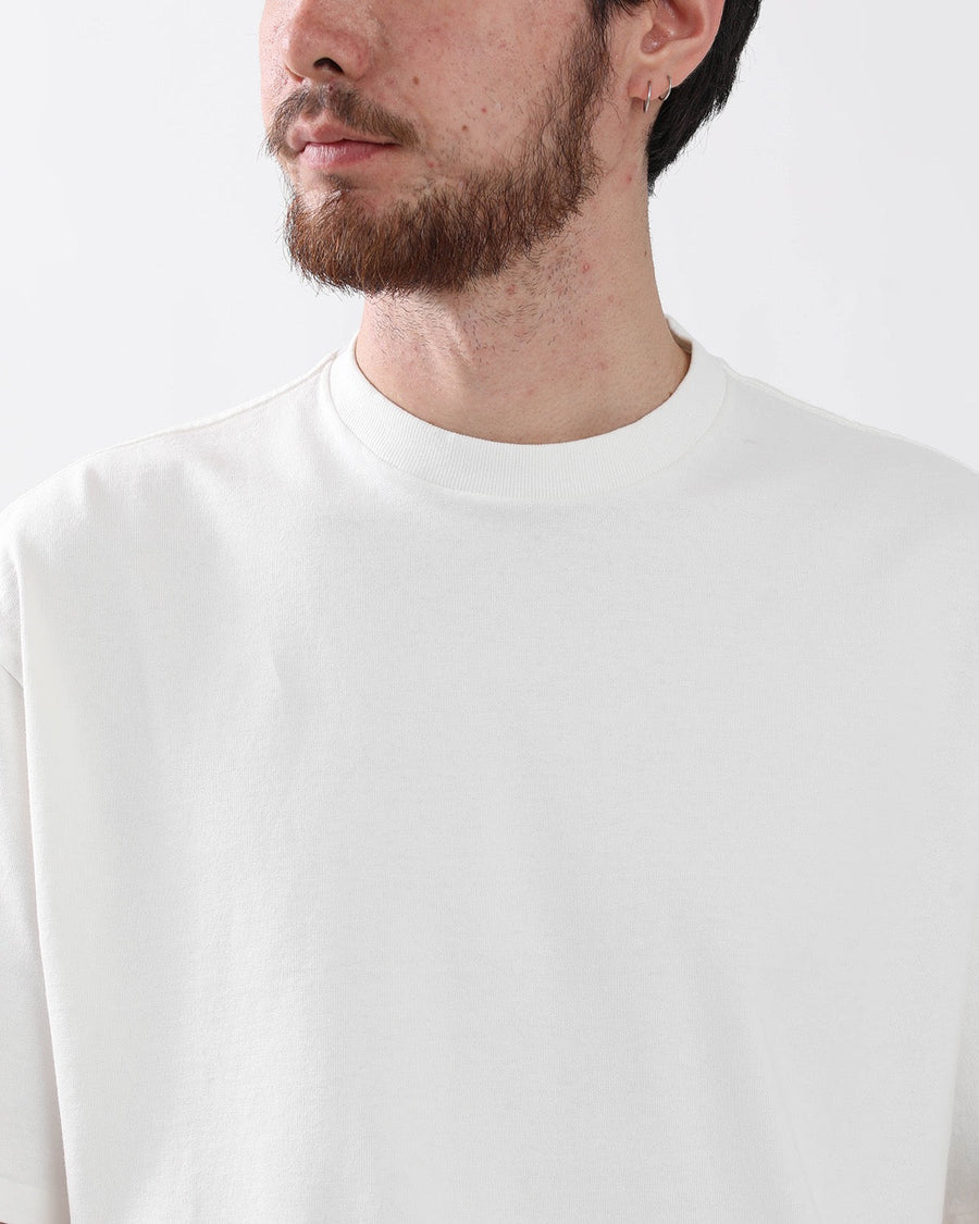 超長綿の中でもとくに繊維が長く綺麗で希少価値の高いコットンの落ち綿と、オーガニック超長綿をブレンドし、太番手で空紡引きした糸で編み立てた天竺を使用した「HEAVY WEIGHT T-SHIRT」です。