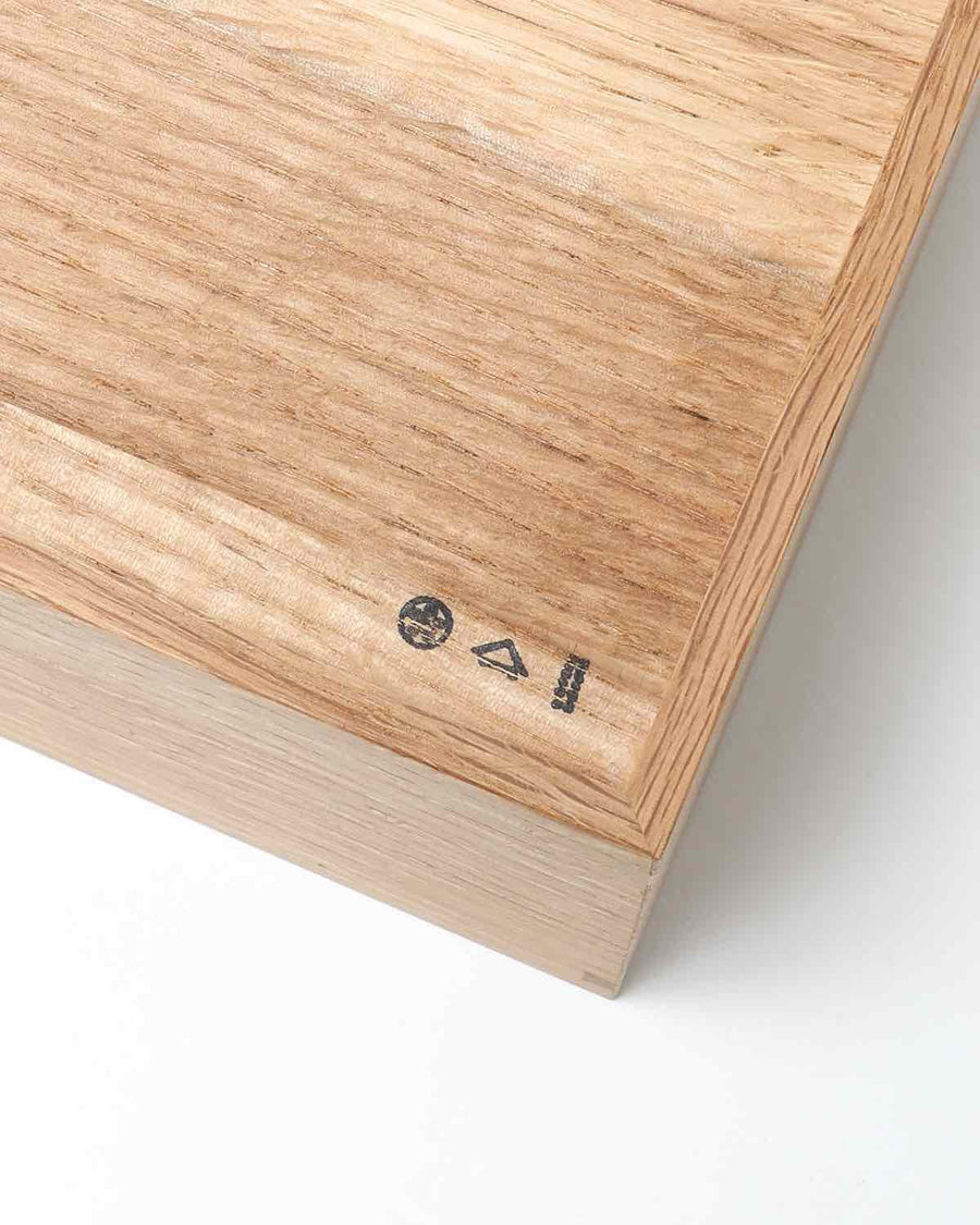 水楢(みずなら)を蜜蝋と荏油(えのゆ)で拭きあげて少しだけ水が染み込みにくくしてあり、洗面台や台所などで使っても水シミなどの心配が多少軽減されます。