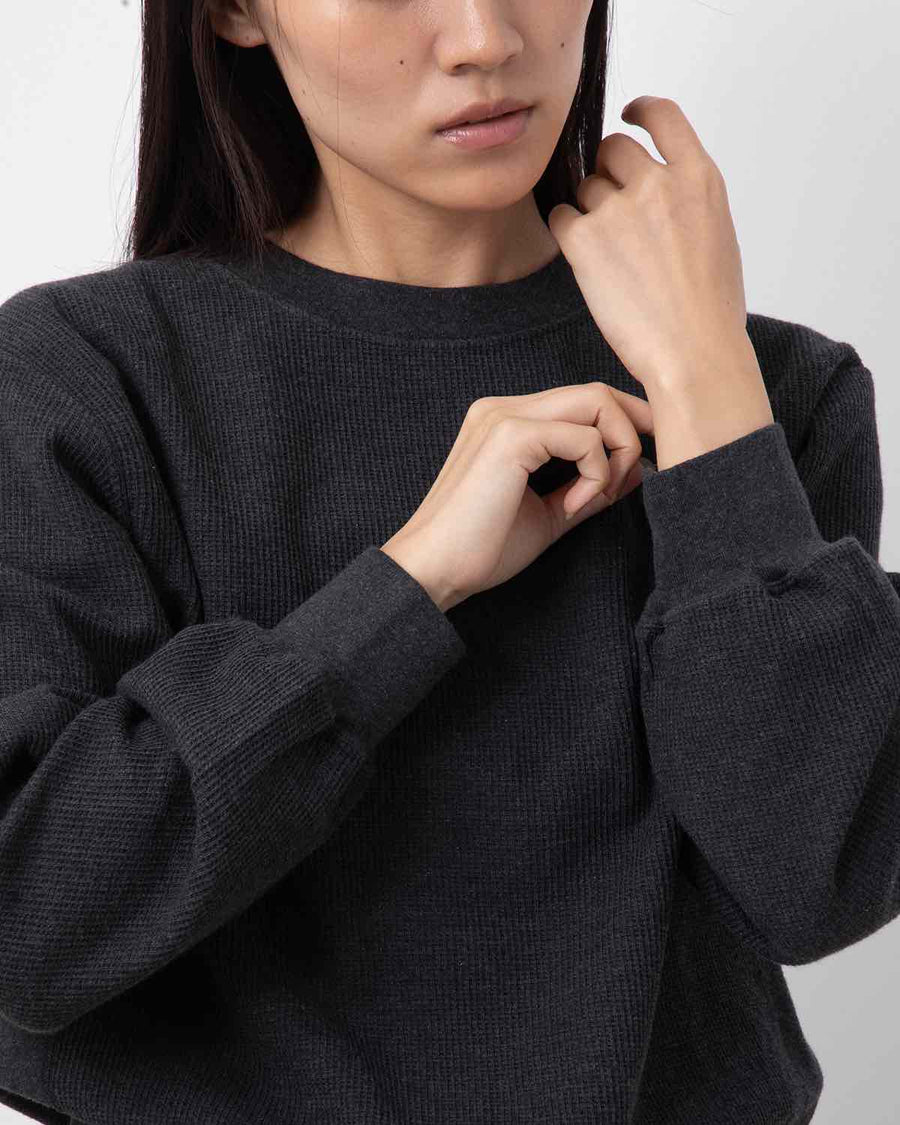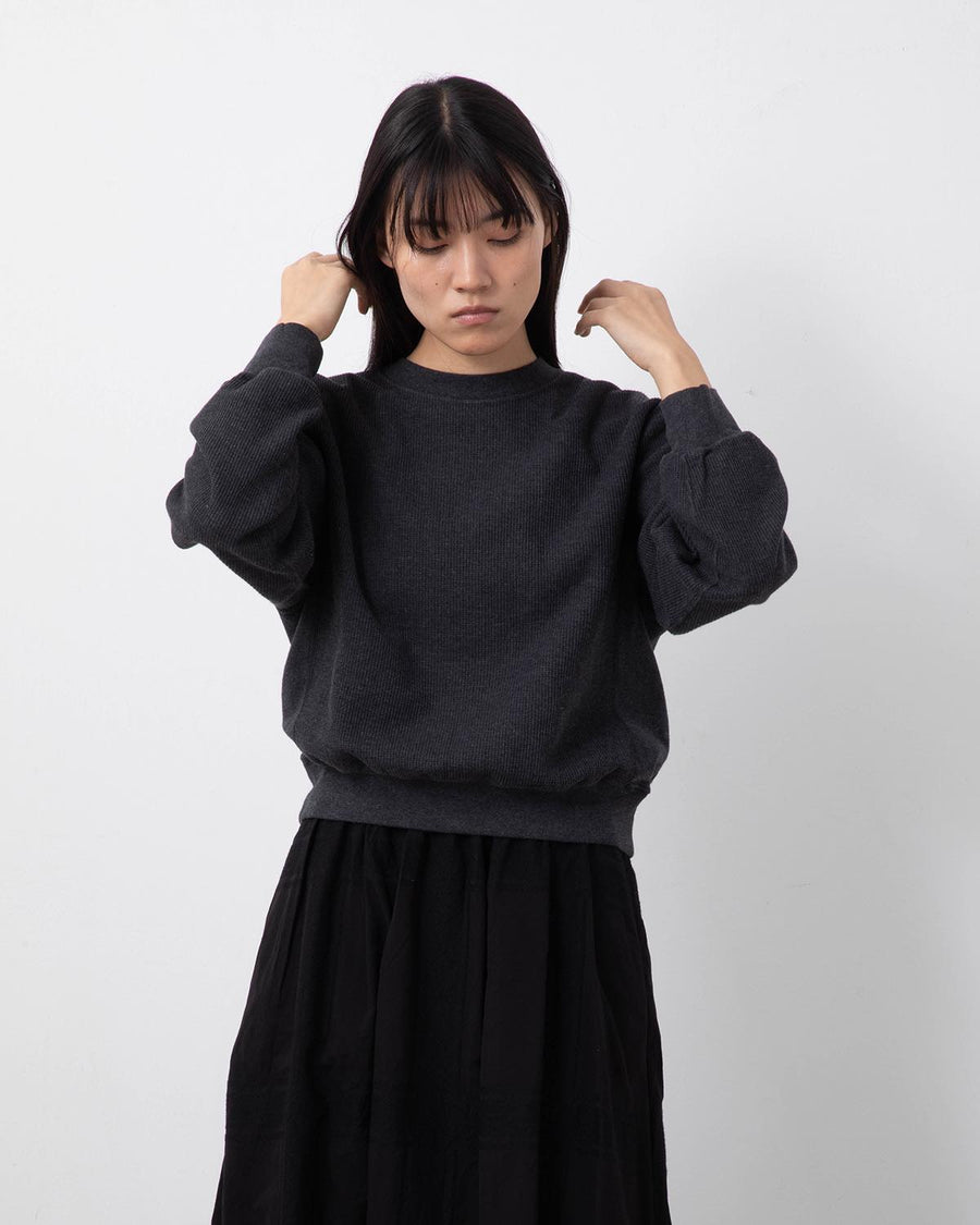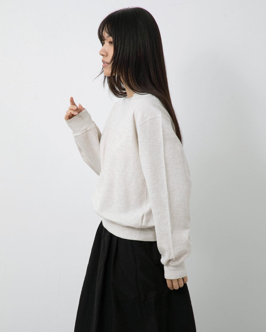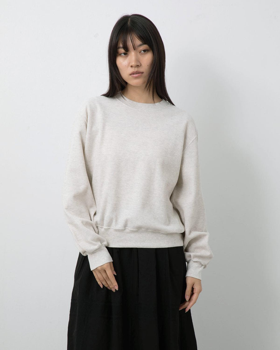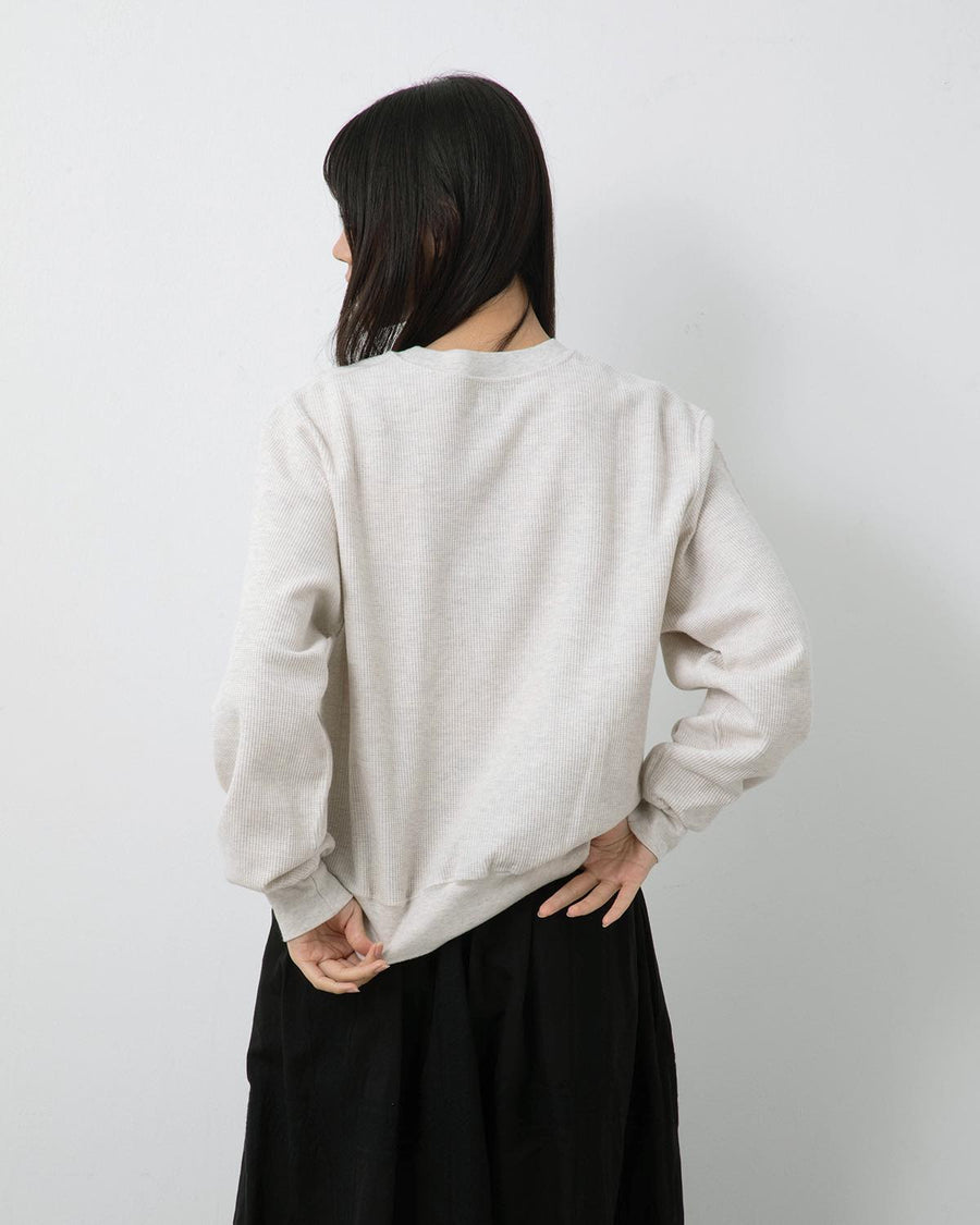 表面を凹凸のあるワッフル生地のように仕立て、裏面を肌触れの良い質感に編み込んだサーマル生地のクルーネックスウェットです。