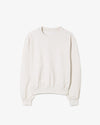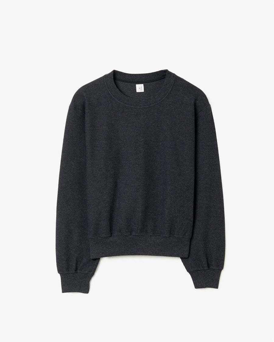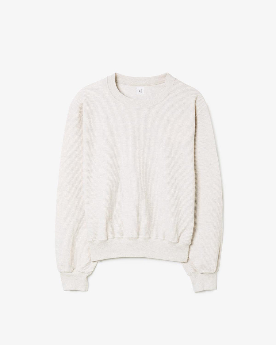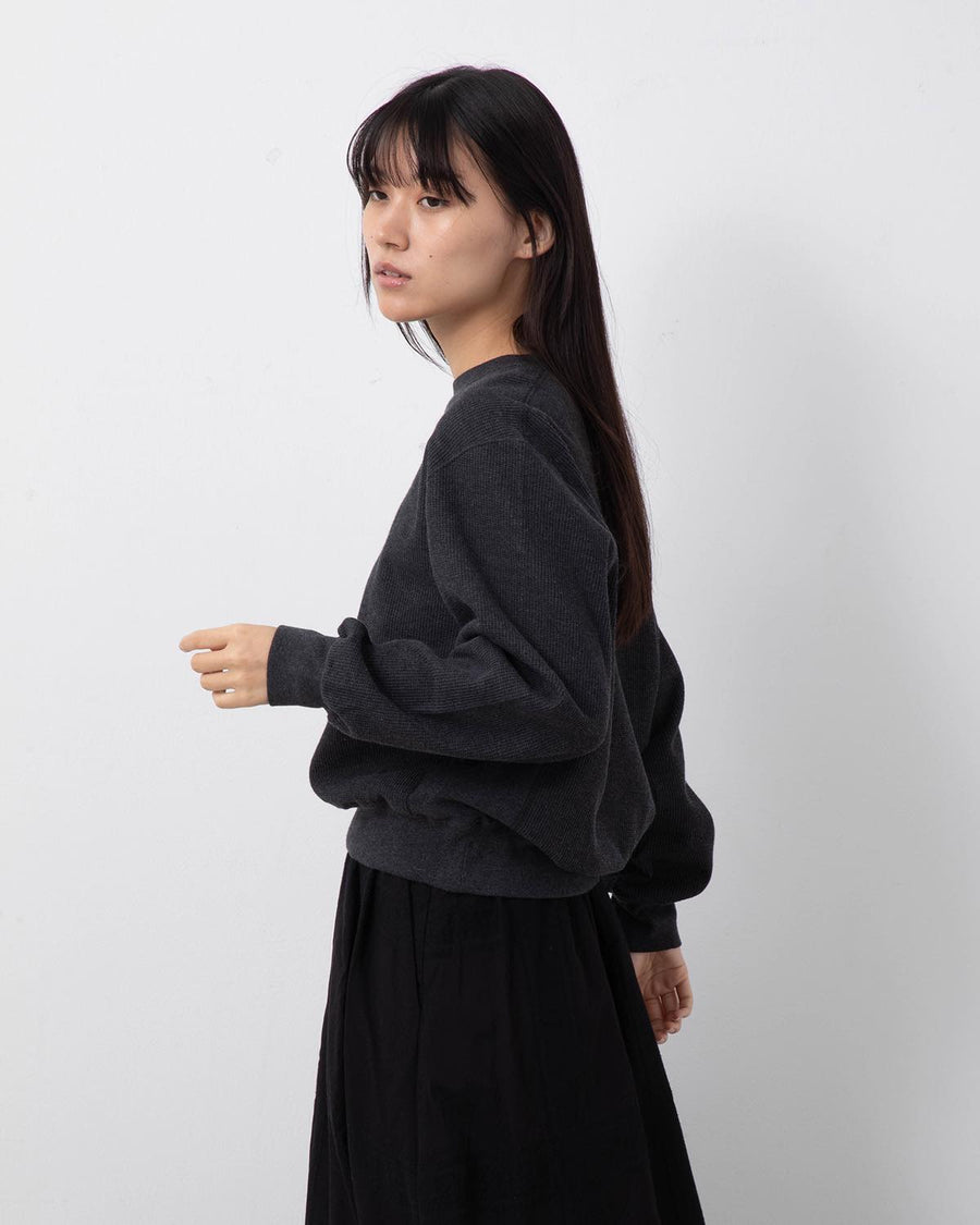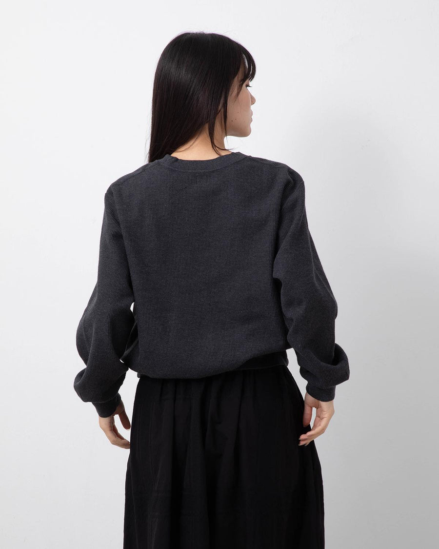 表面を凹凸のあるワッフル生地のように仕立て、裏面を肌触れの良い質感に編み込んだサーマル生地のクルーネックスウェットです。