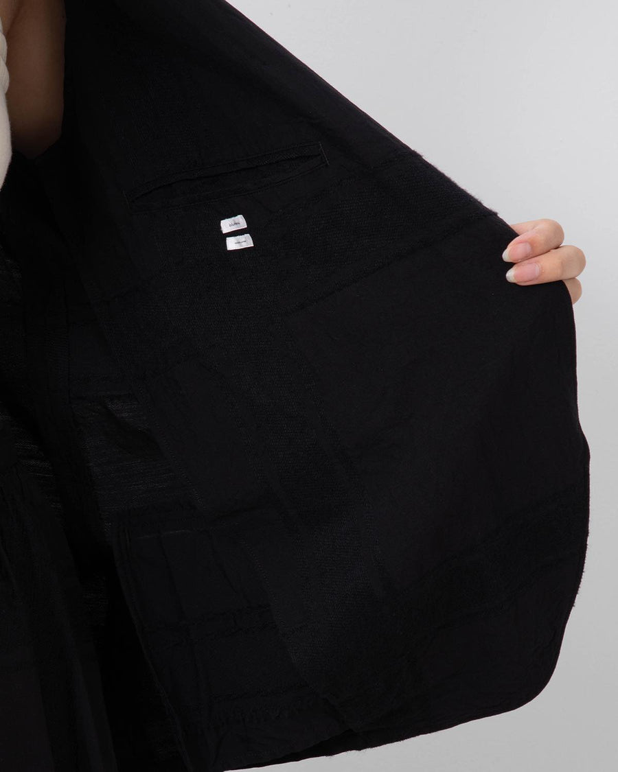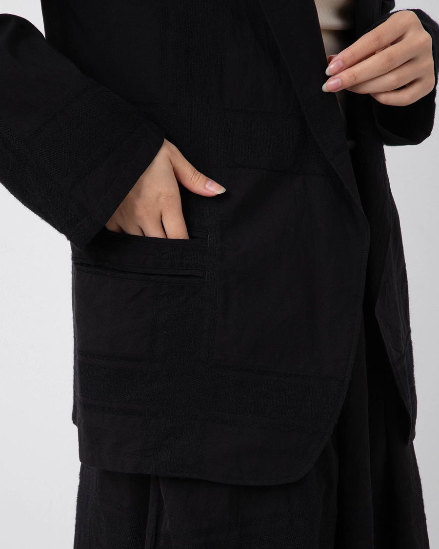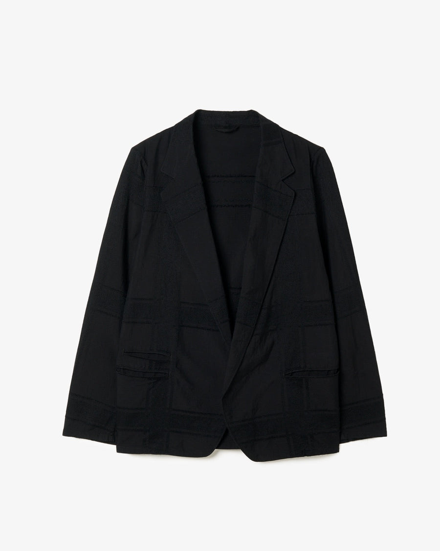コットンとキュプラをベースに柄部分にウールを使用し、刺し子調の組織で織り上げたシャドーチェック素材のジャケットです。