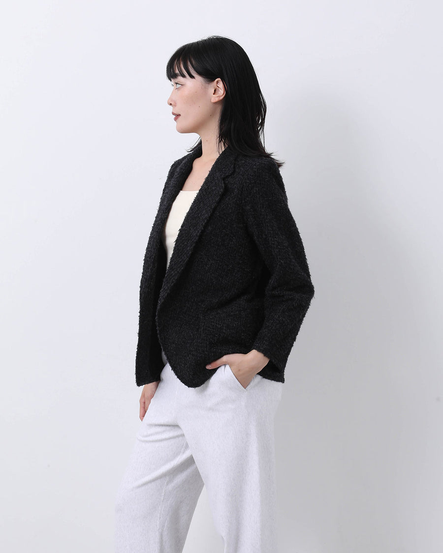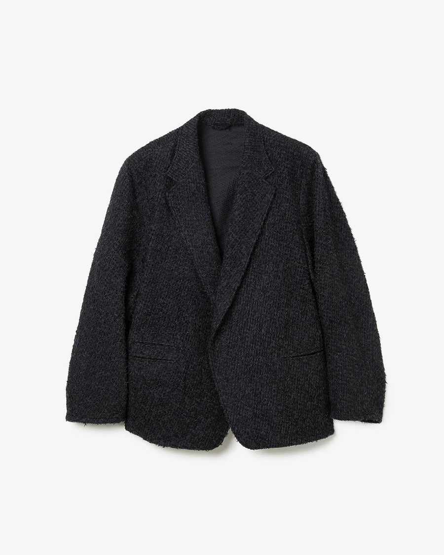 表地にウールを使用し、細かくカットした後に洗いをかけることでウールを縮め、不揃いで独特な表面感を生み出したジャケットです。