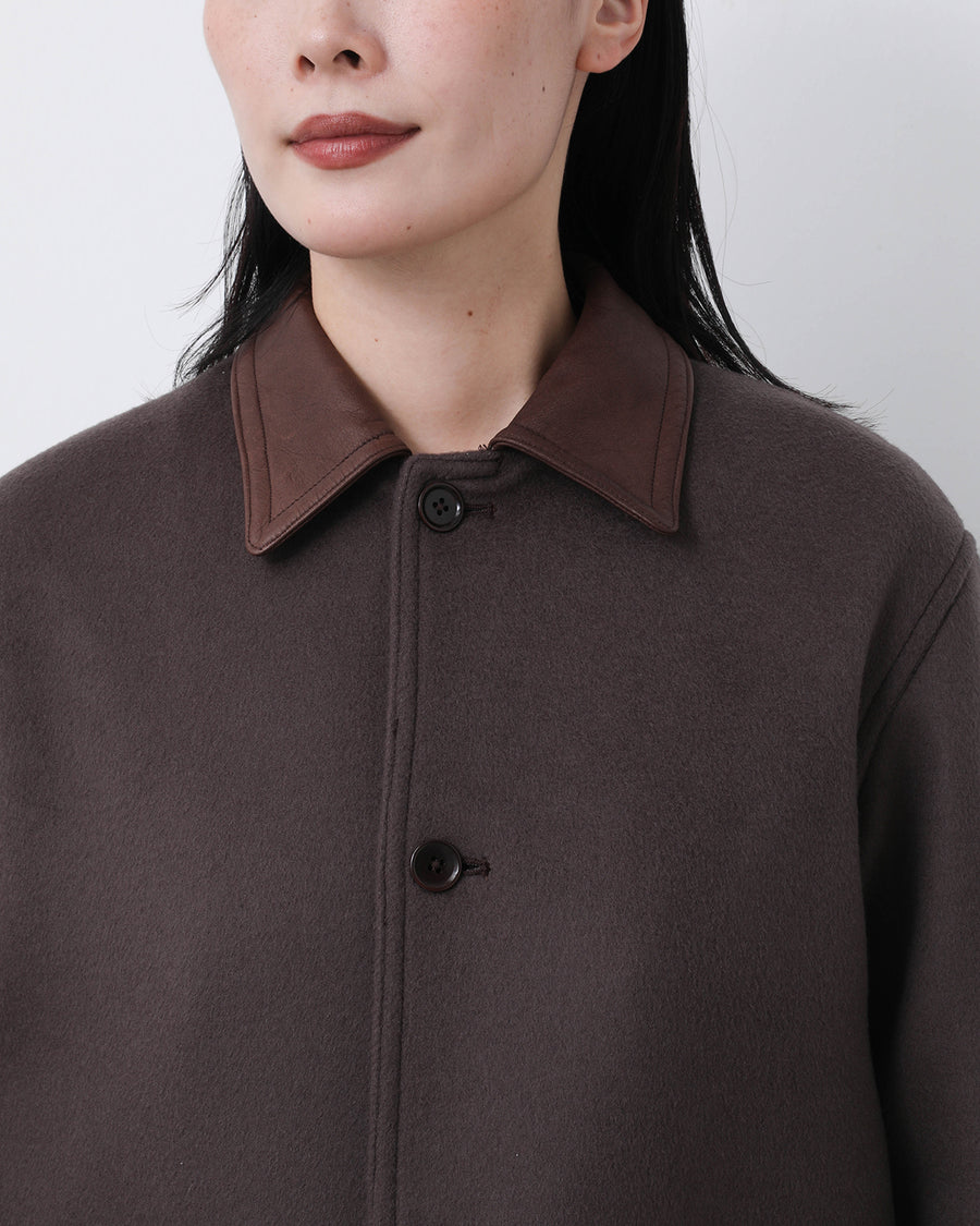 襟、袖裏に使用した、ウォッシャブルのカウレザーがアクセントになっています。