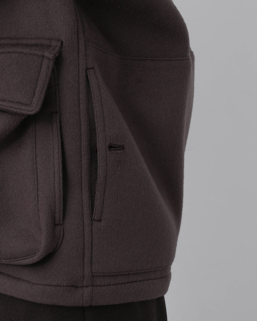 ハンティングジャケットの肩当てなどを除き、フロントのマチつきポケットがアクセントとなった、ハーフコート風のデザインです。