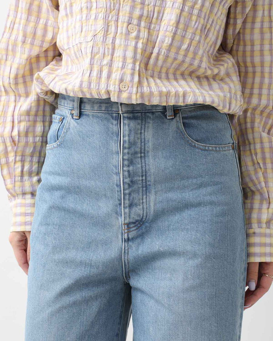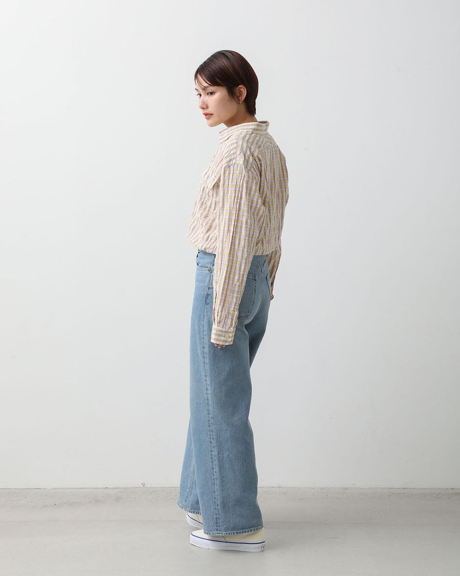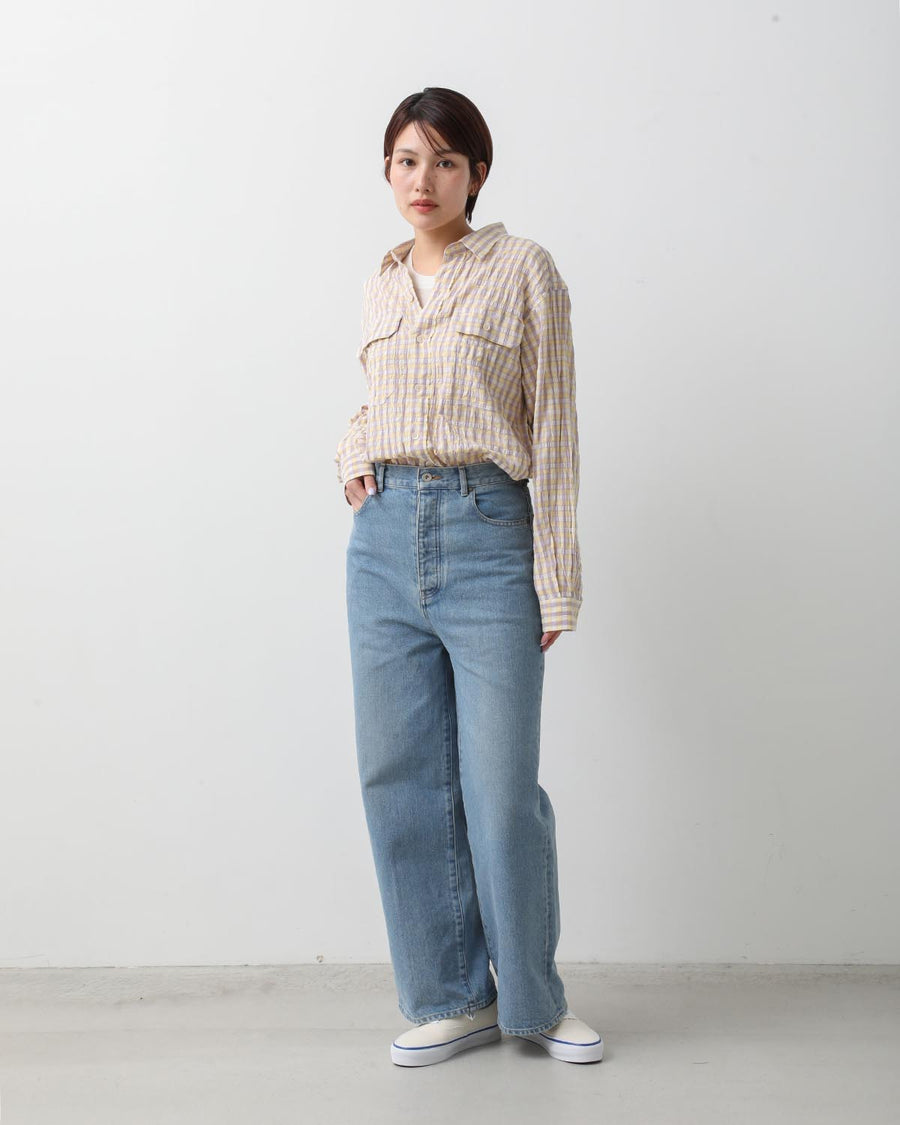 かなり太い糸を使用していますが、糸の形の調整や撚りを緩く紡ぐことで軽く優しい雰囲気になるように仕上げたデニム生地のワイドデニムです。