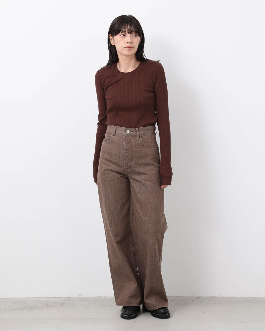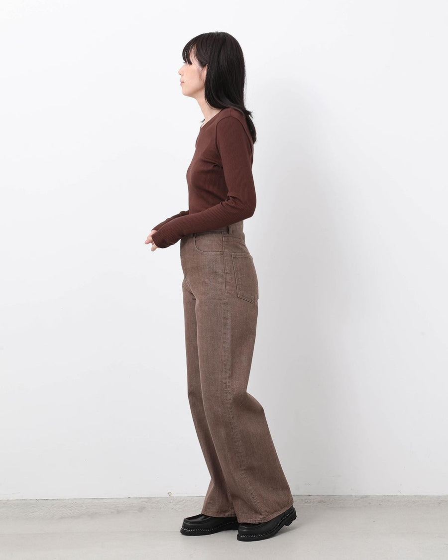 オーセンティックな表情を作るべく、ムラ感の出る糸を使用しながらも、たて糸にブラウンに染めた糸をもってくることで、柔らかな雰囲気に仕上げています。 こちらは定番の「BISOWN DENIM」をベースに、綺麗なヒップラインを維持したセミワイドシルエットモデルです。