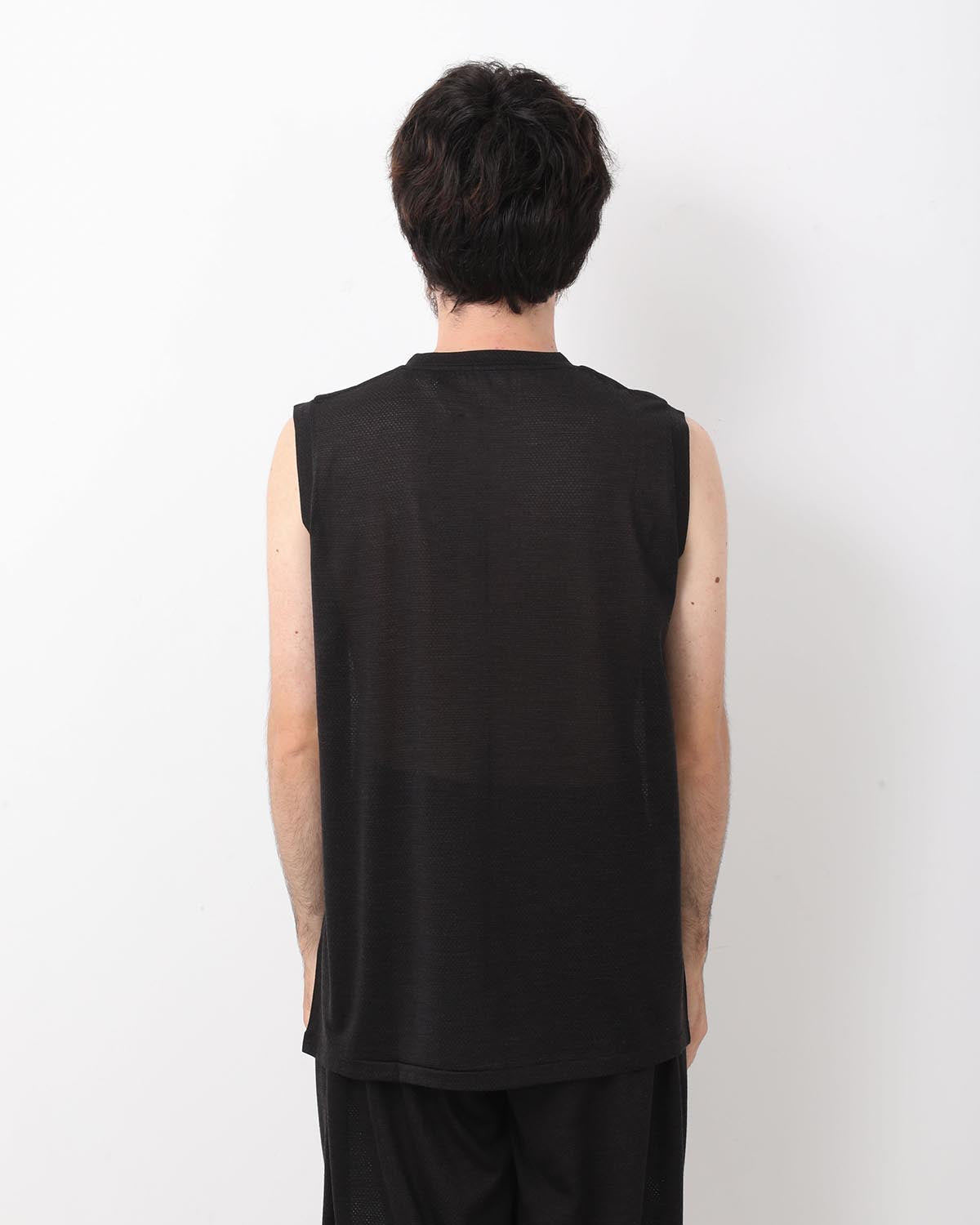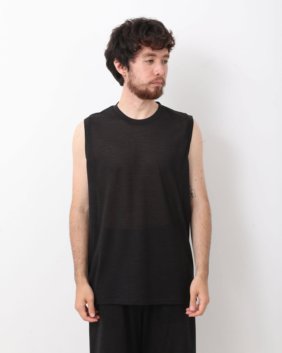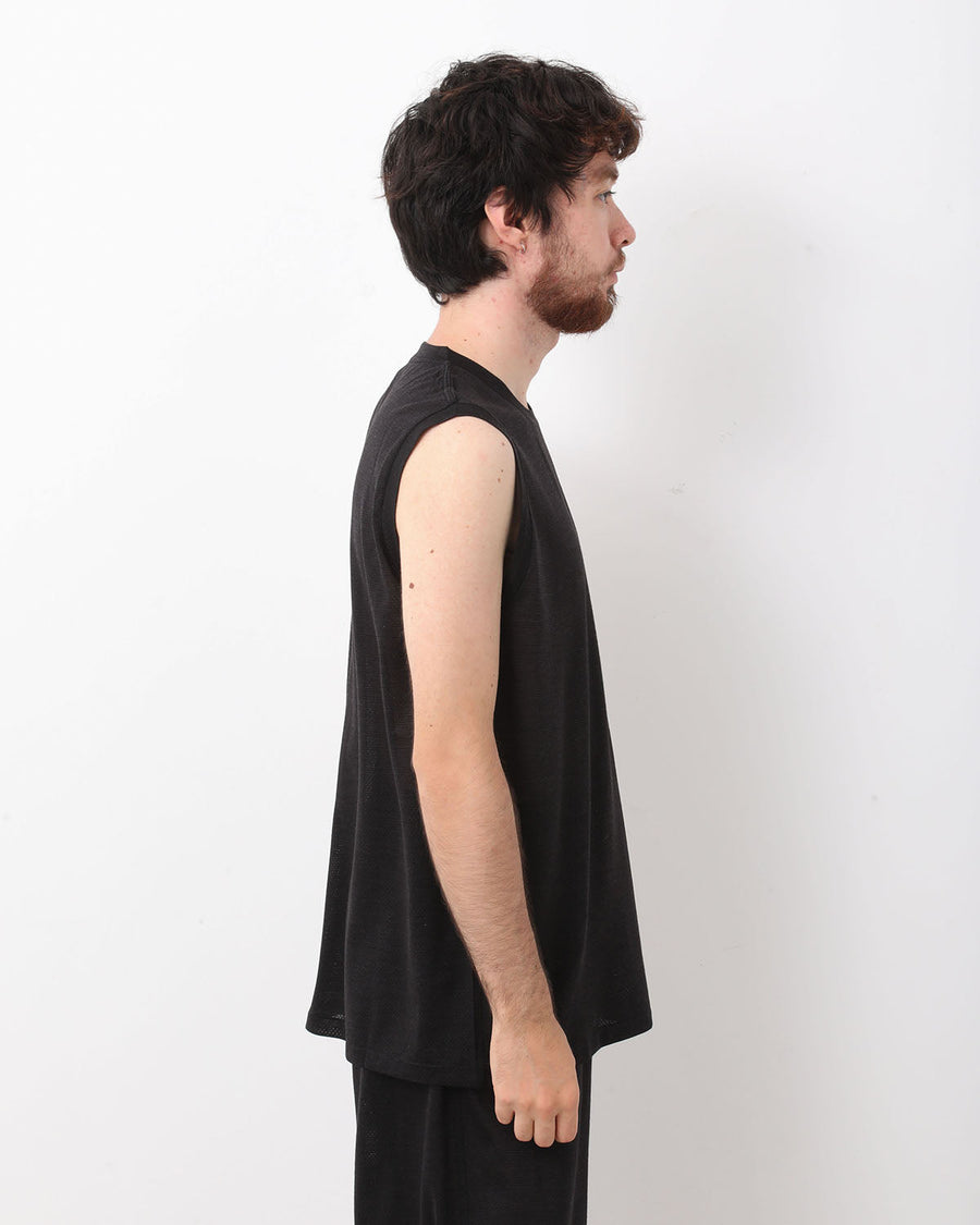 猛暑が続く日本の夏に、少しでも風通し良く着られるメッシュが着たいと思い製作された、ウールメッシュノースリーブです。