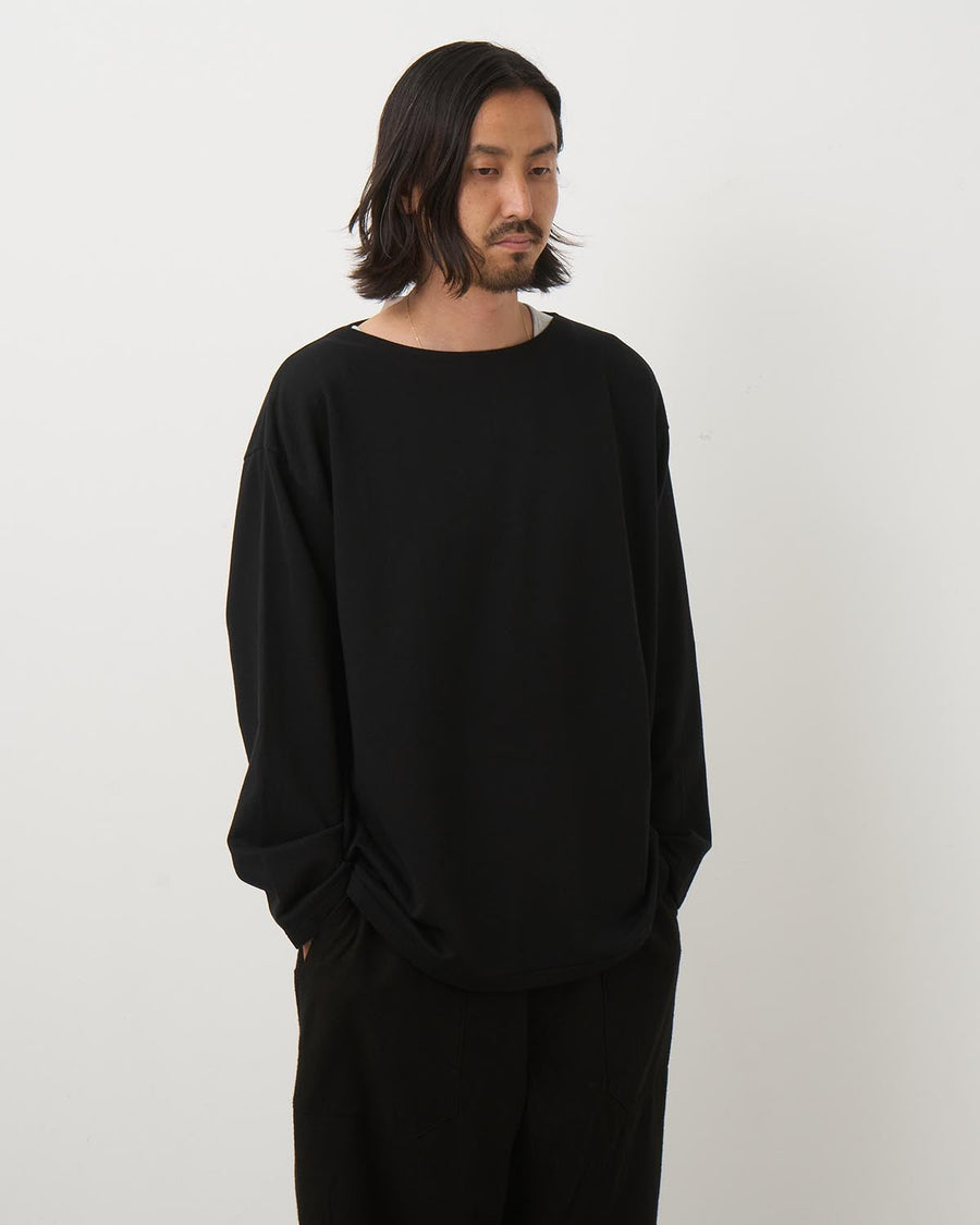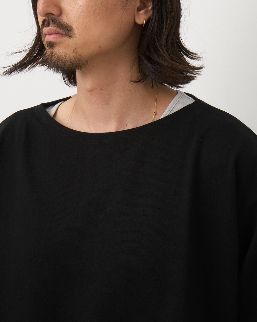 リラックス感のあるボートネックで、残暑の残る夏の終わりから秋にかけて、ざっくりと着用できる1枚です。