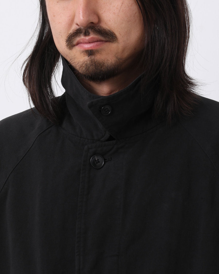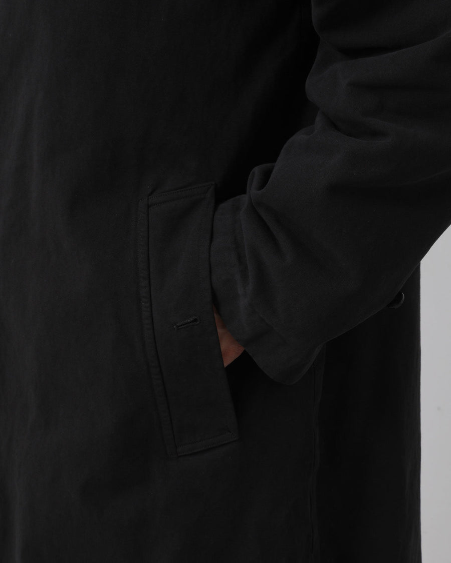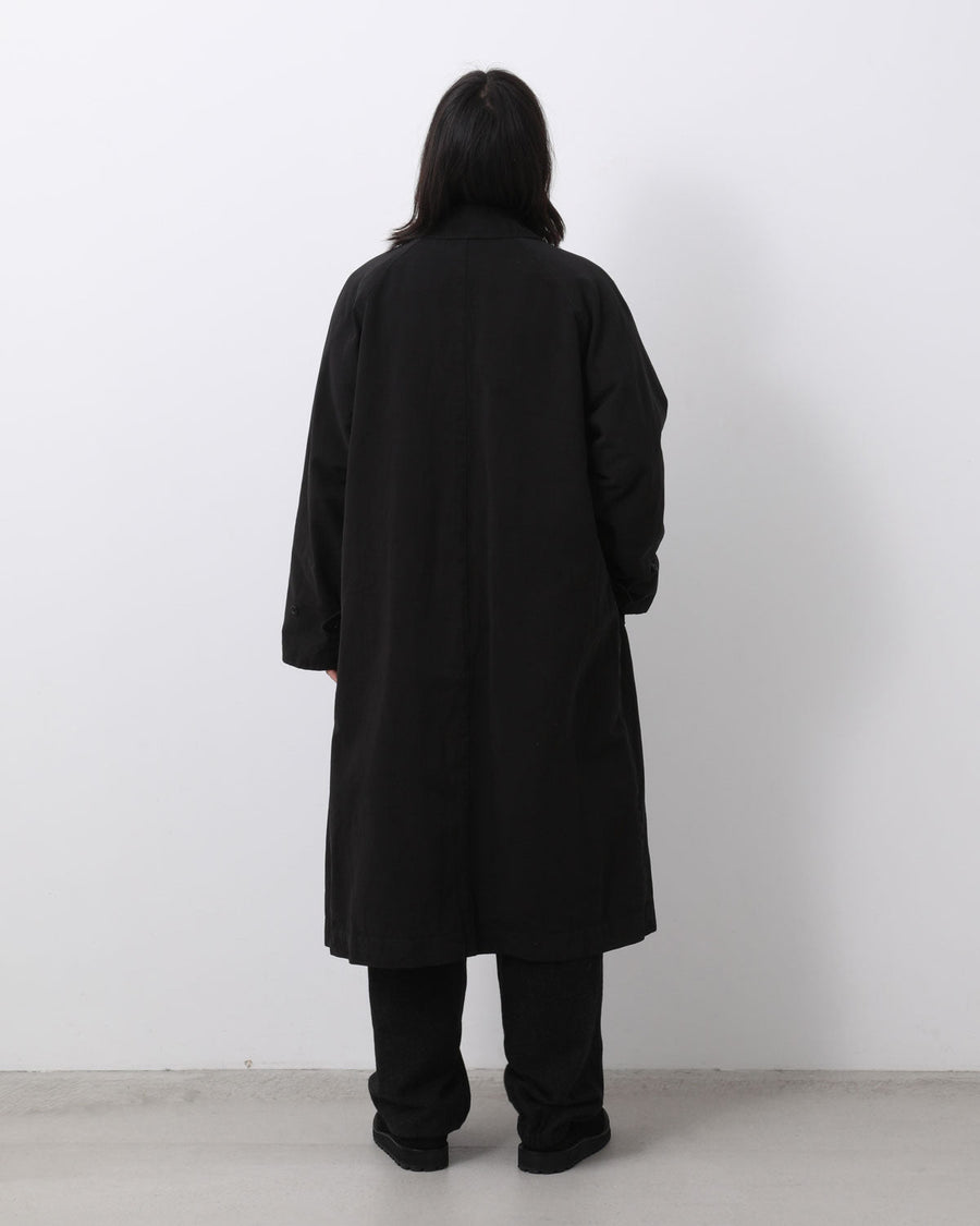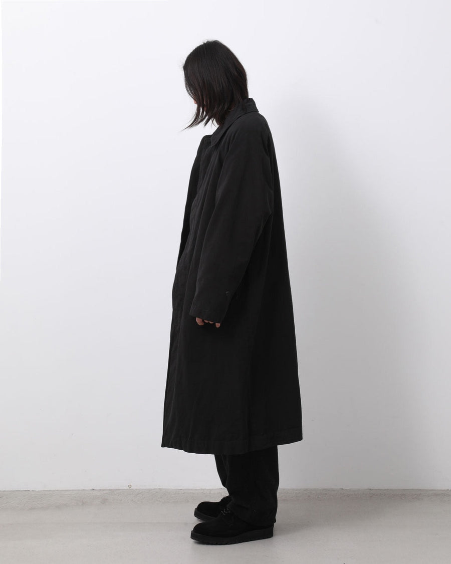 24AWから継続している型をベースに、着丈をやや長く調整した「製品染バルカラーコート」です。