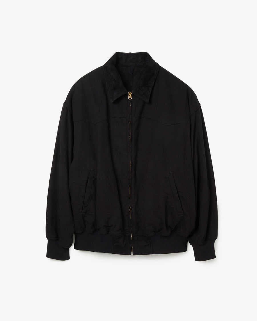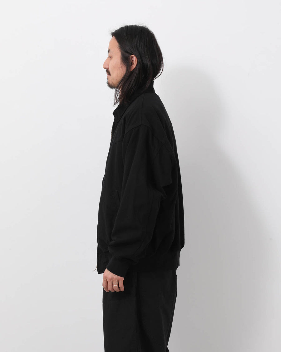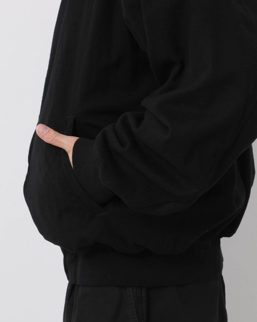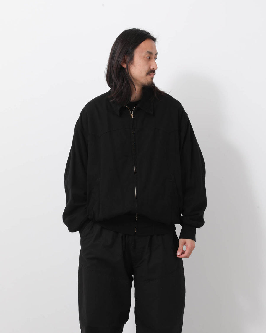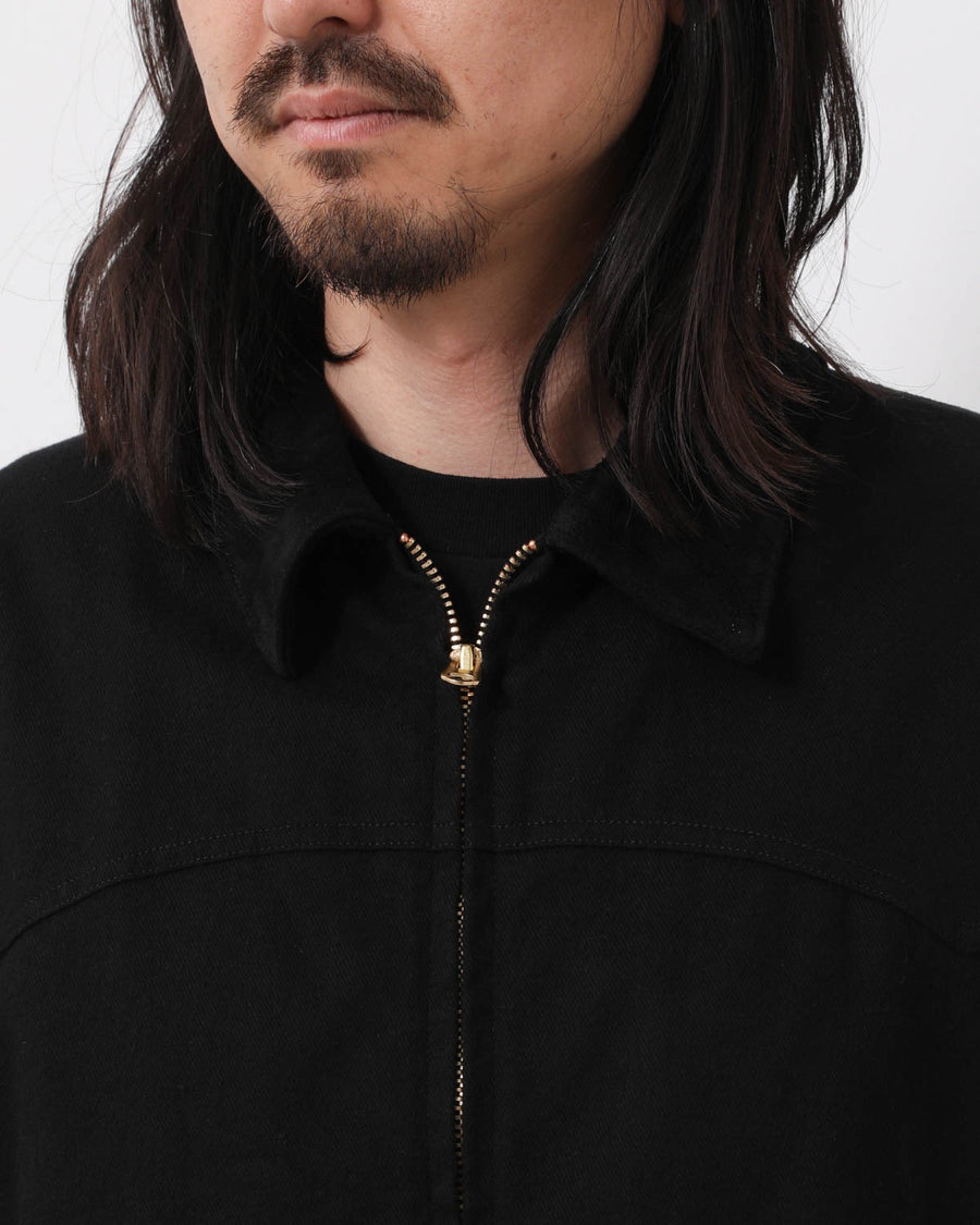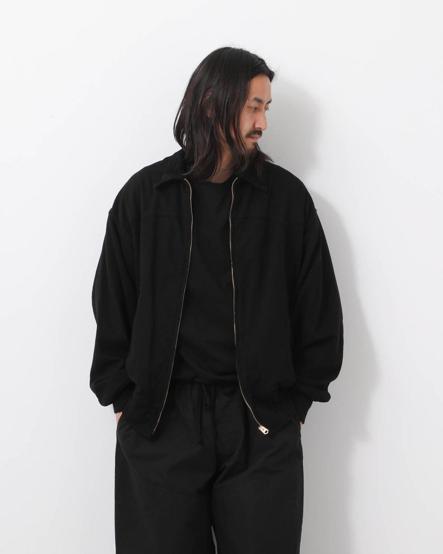 柔らかく微起毛感のあるコットン100%のブラックドリル生地で仕立てた、ジップアップジャケットです。