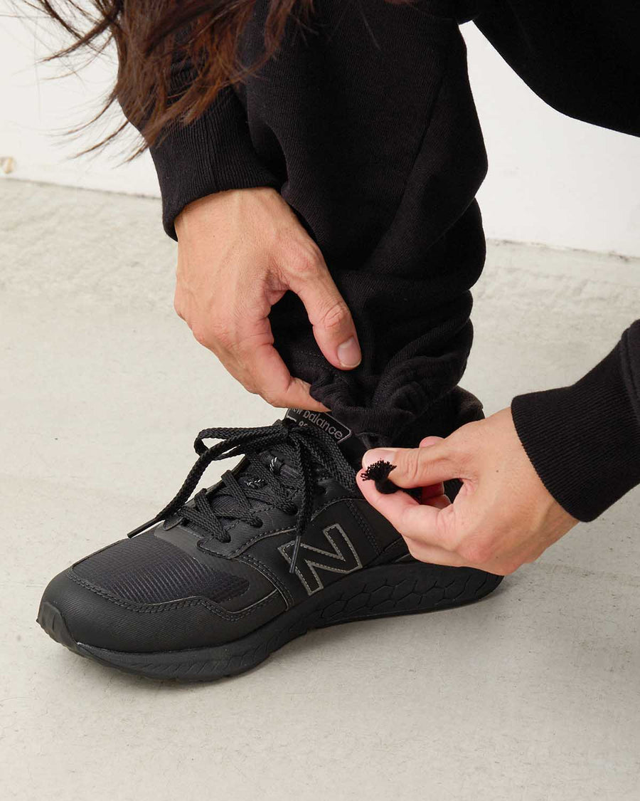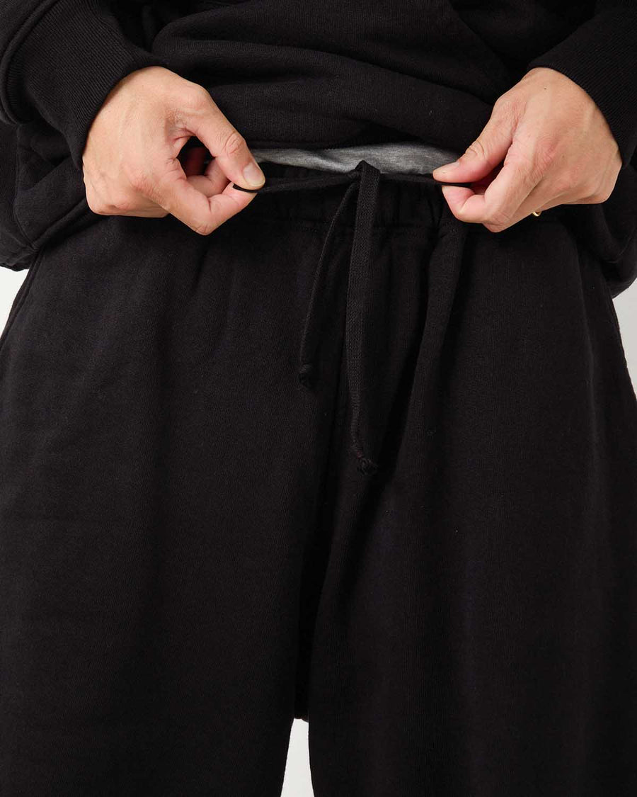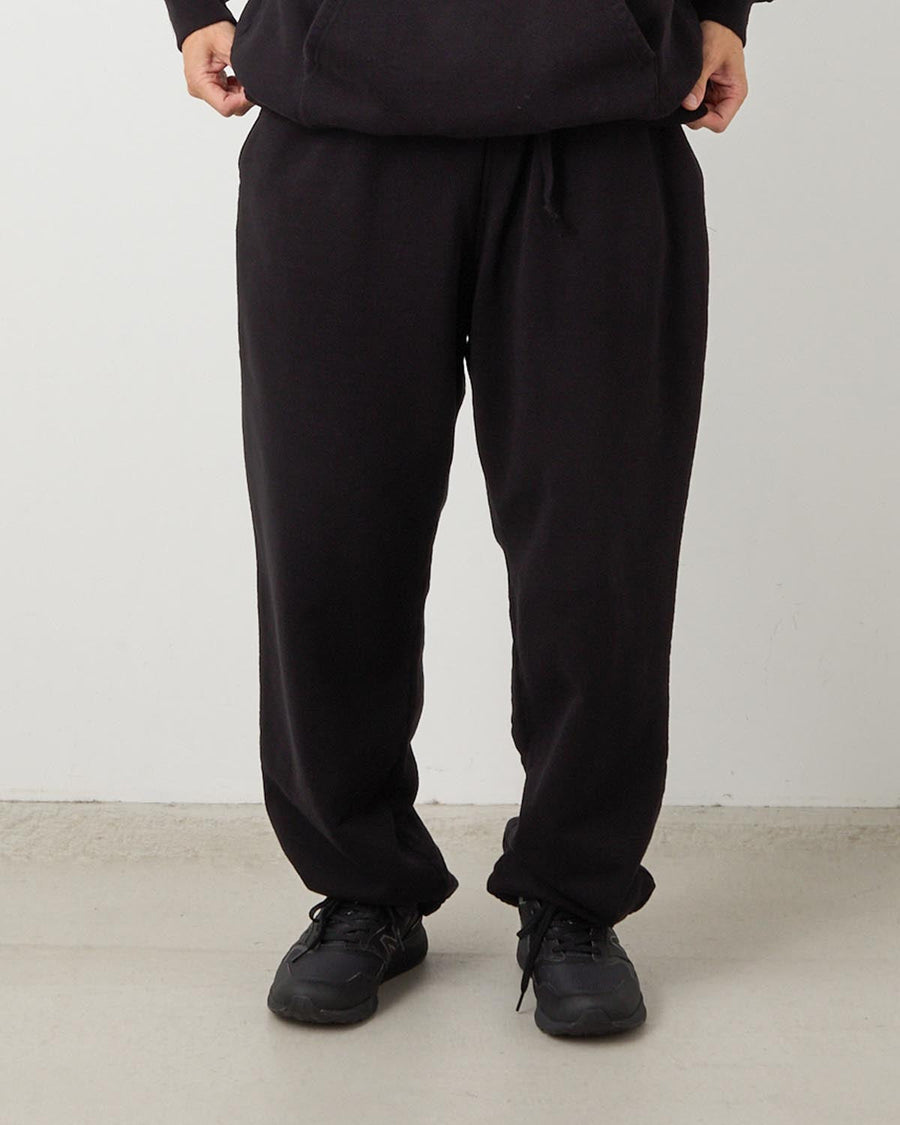フェードしていないブラックカラーのコットン裏毛生地に洗い加工を施したイージートラウザーです。