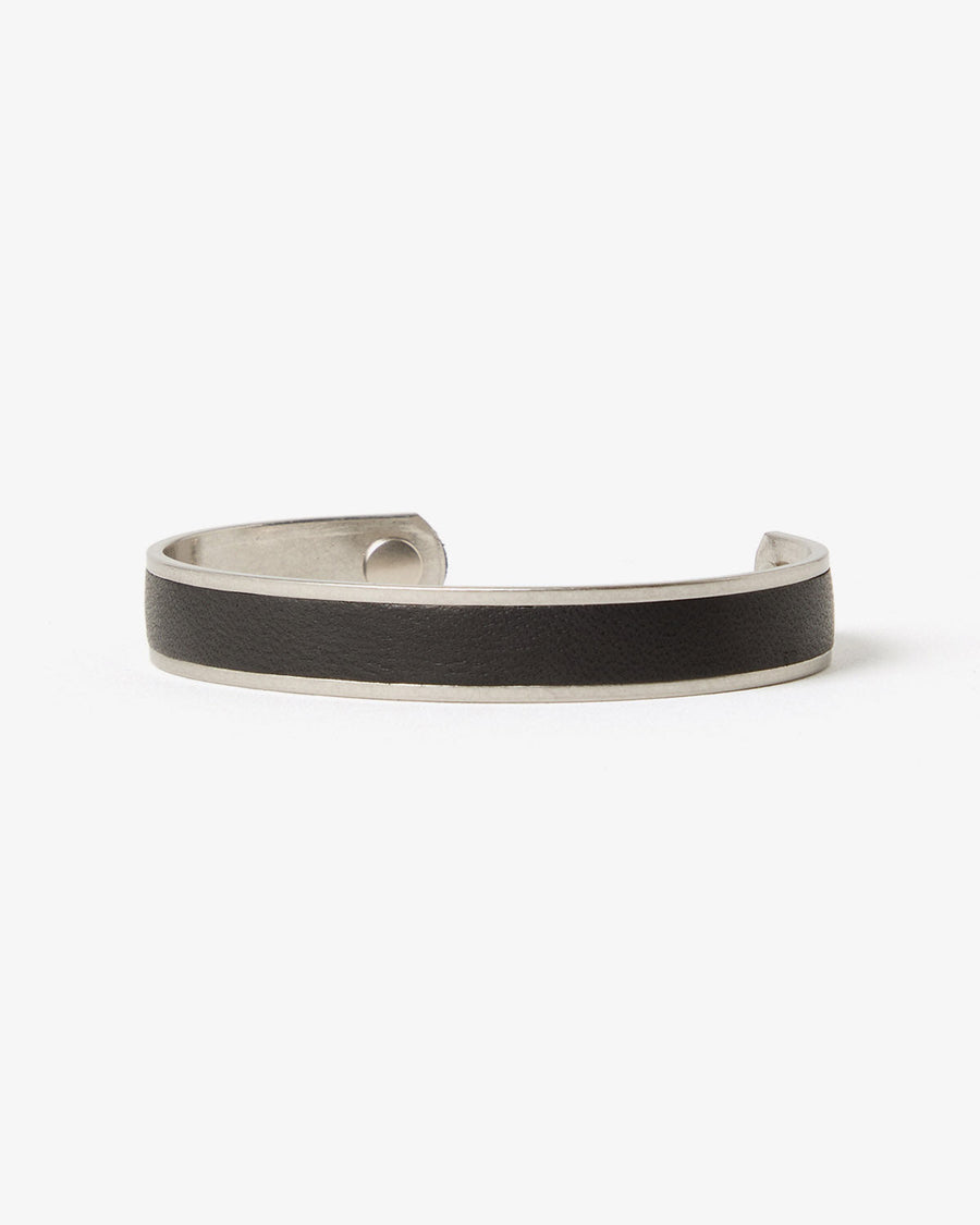 凹字型のブラス製プレートの溝を埋める形でシュリンク加工を施したホースレザーをあしらったコンビ素材のブレスレットです。