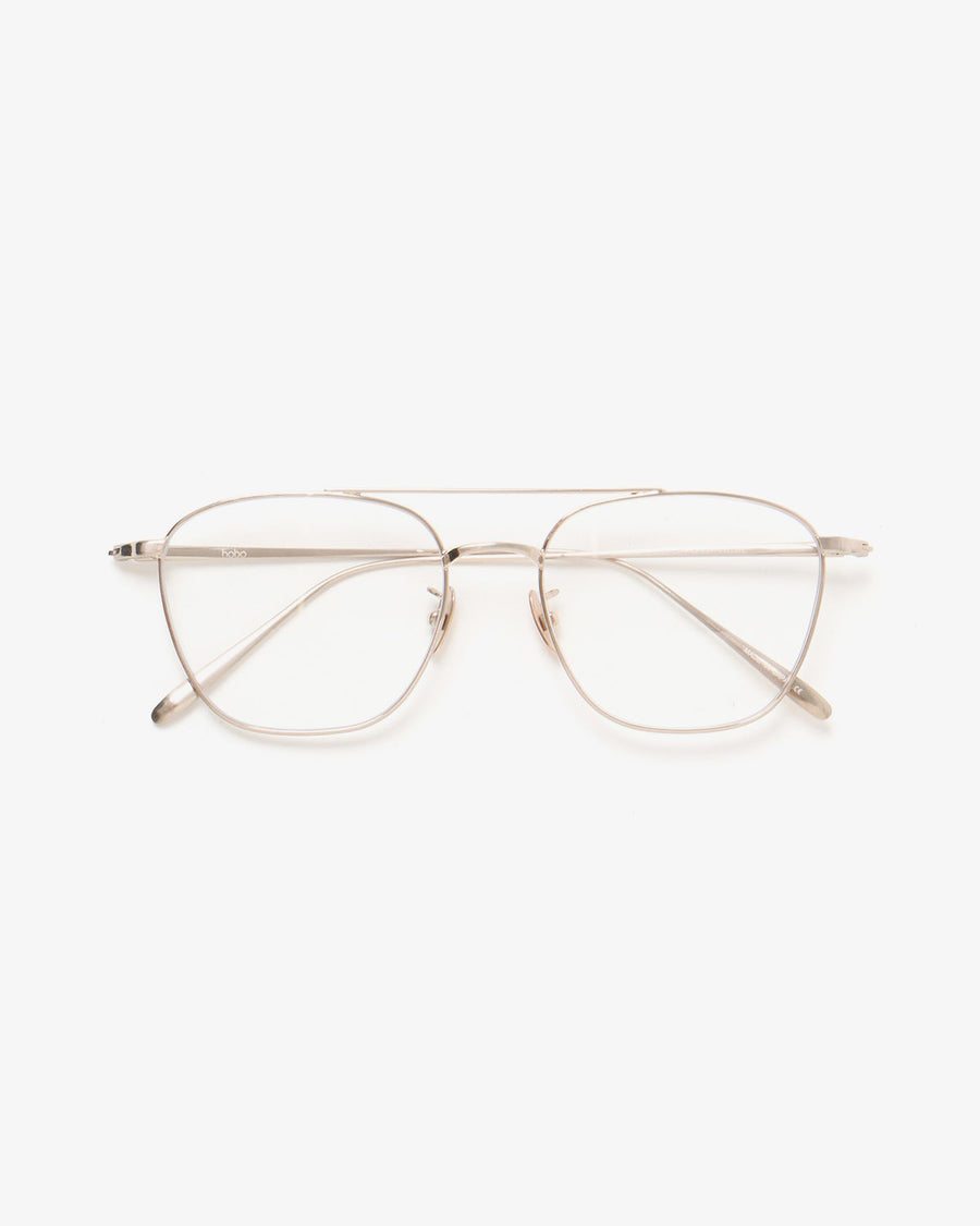 〈hobo〉が〈金子眼鏡〉に別注製作を依頼したメタルフレームのクリアグラスです。