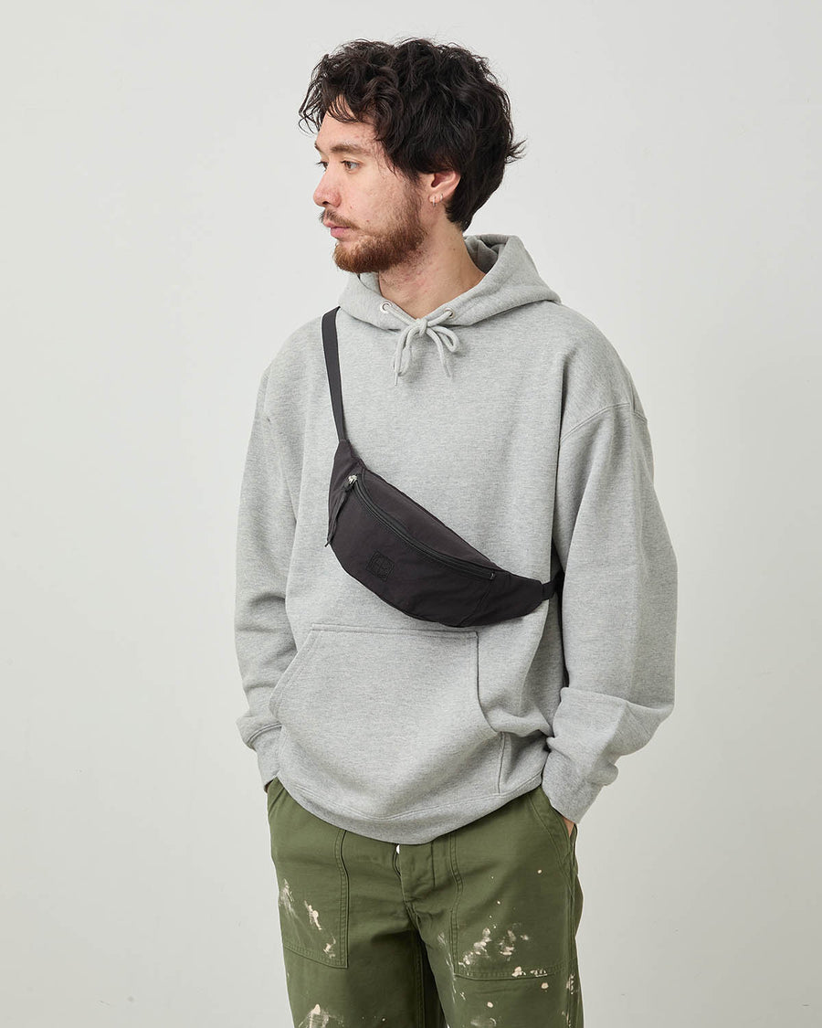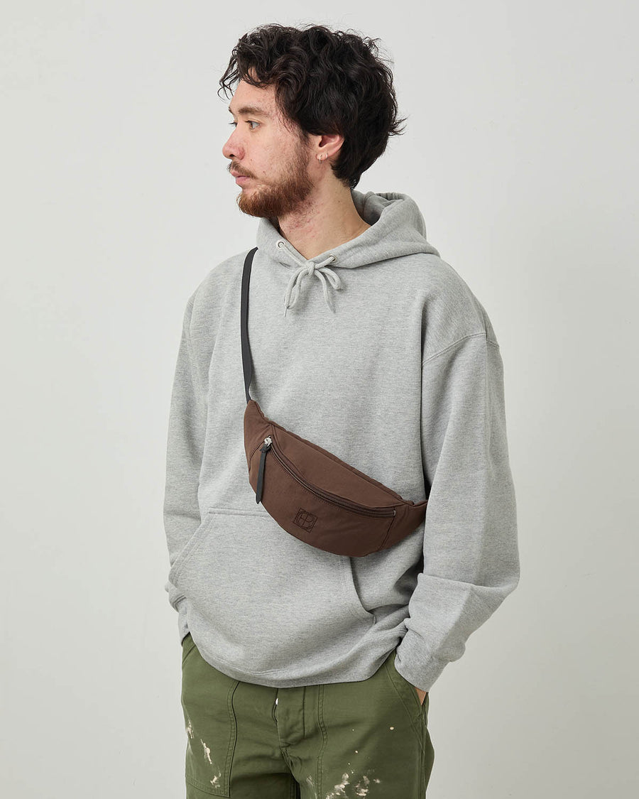 ナイロンを天然色素で染め上げた合繊素材を使用したベーシックな小型ウエストポーチです。