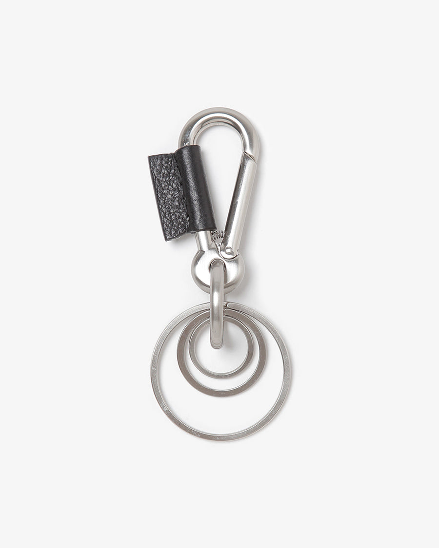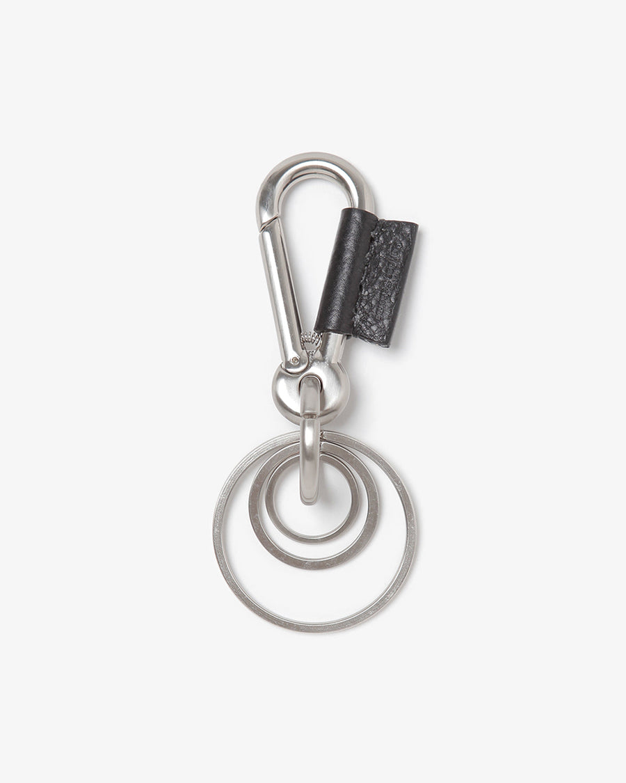 鍵が何層にもつけられる仕様で、カラビナ部分の〈Hender Scheme〉型押しロゴ入りレザーパーツがアクセントになったデザインです。
