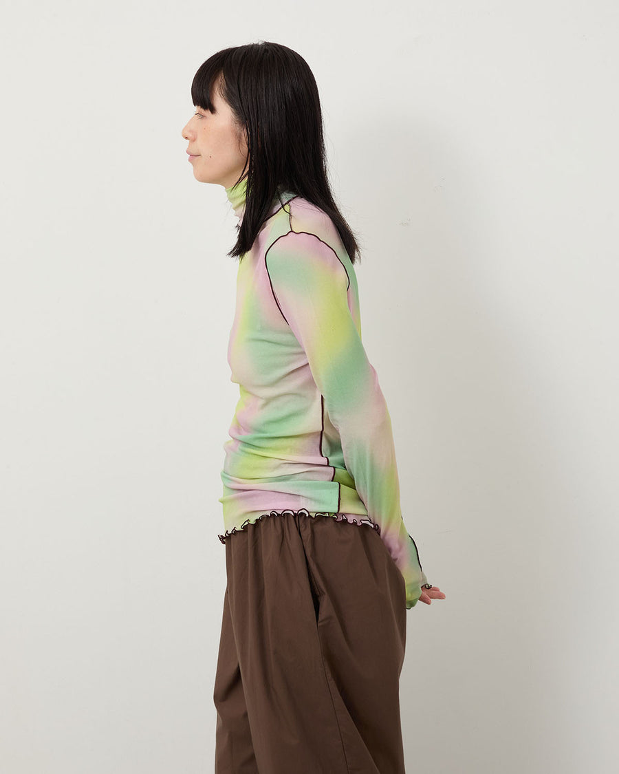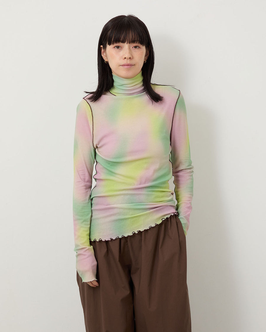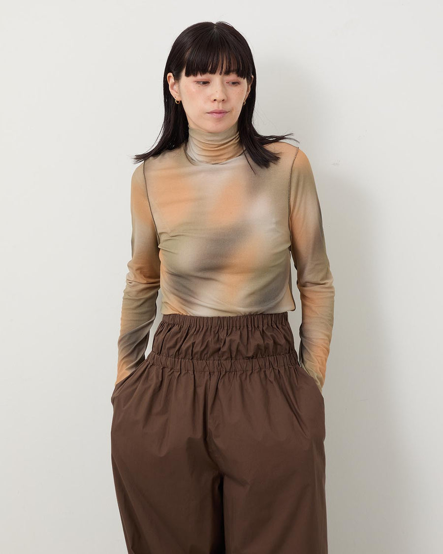 細番手のコットン糸で編み立てた繊細なシアーフライス生地に、ミックスしたカラーをマーブル状にプリントしたハイネックシアーカットソーです。