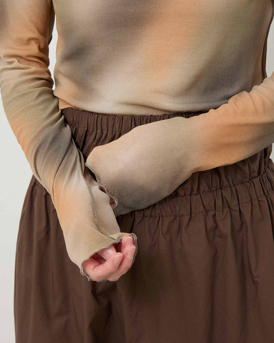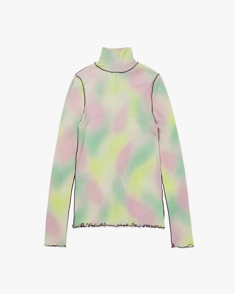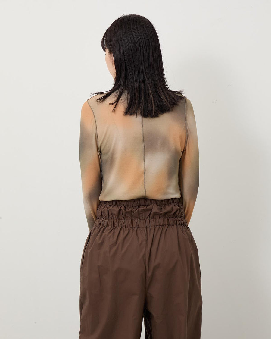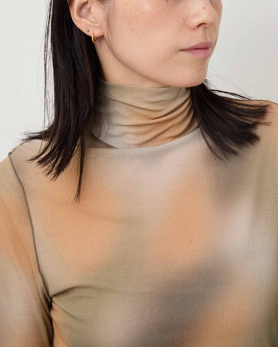 細番手のコットン糸で編み立てた繊細なシアーフライス生地に、ミックスしたカラーをマーブル状にプリントしたハイネックシアーカットソーです。
