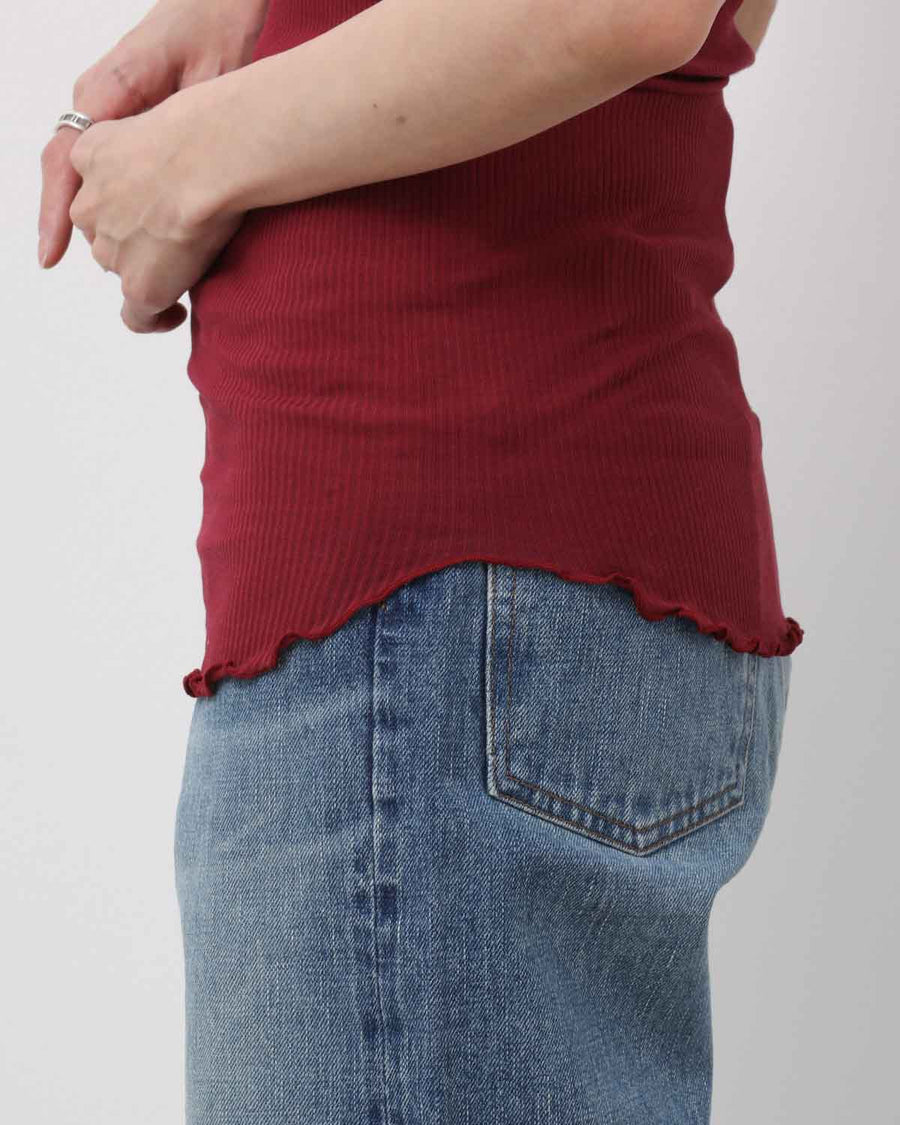 アメリカ産の超長綿を丸胴編み機で編み立てた、肌離れの良い繊細なリブ素材を使用したタンクトップです。