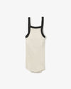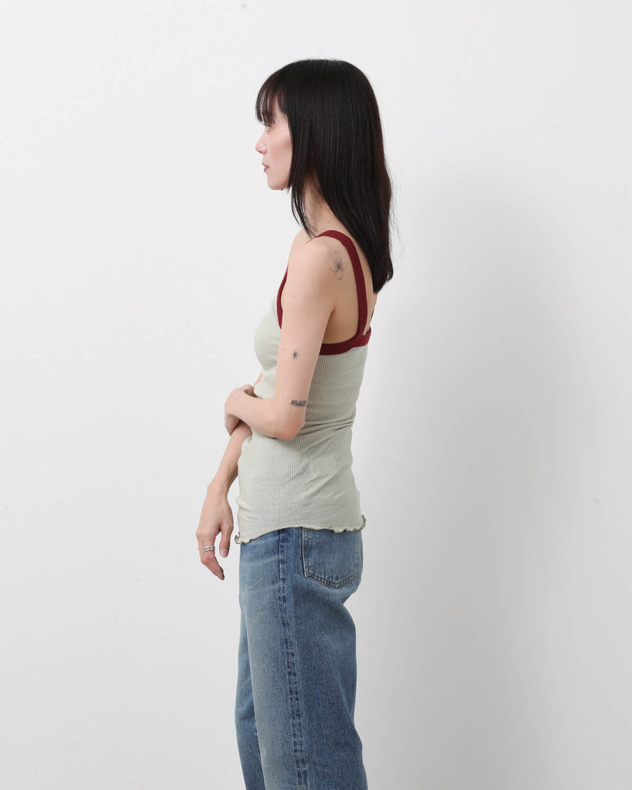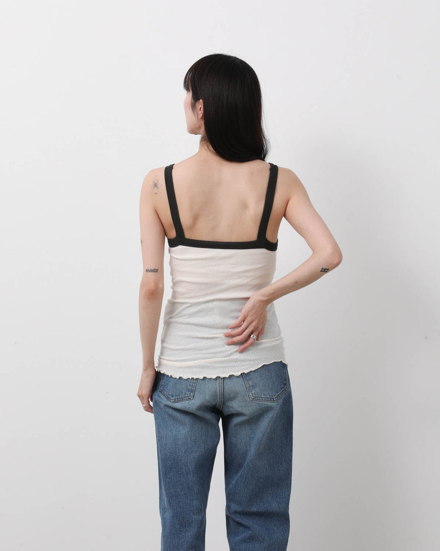 アメリカ産の超長綿を丸胴編み機で編み立てた、肌離れの良い繊細なリブ素材を使用したタンクトップです。
