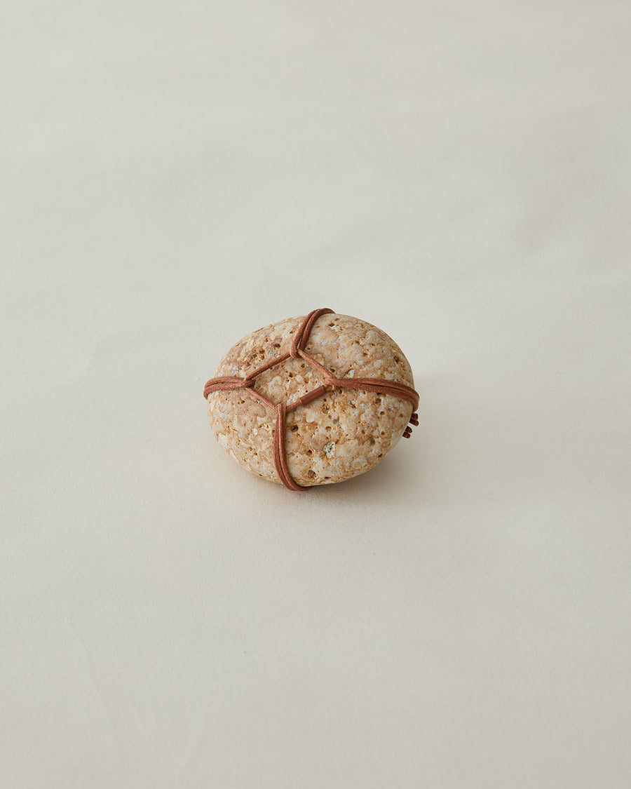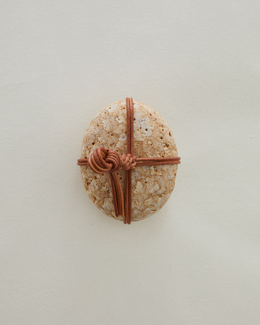 自然の中で生まれた豊かなフォルムを持つ石を、革紐を使い伝統的な結びによって包んだ作品「SEKIMORI STONE」です。