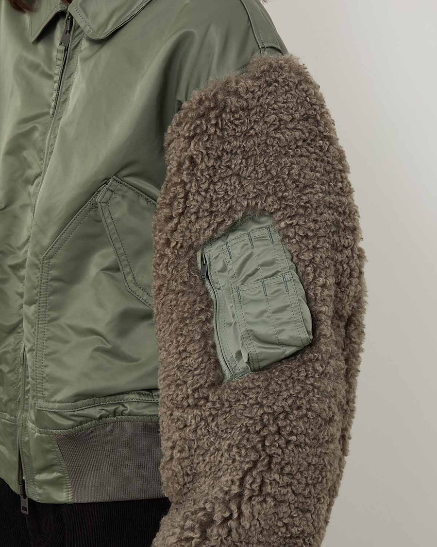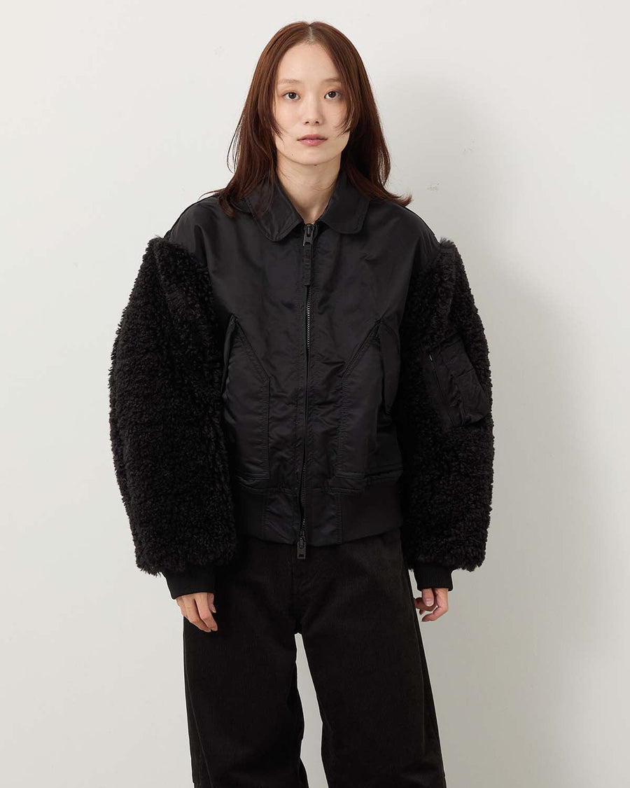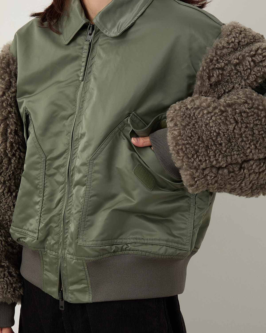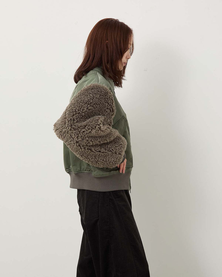 袖はポリエステルファー、身頃はナイロンツイルを使用をしたブルゾンです。