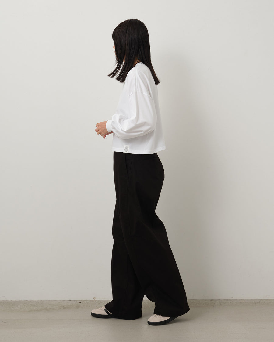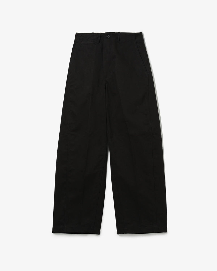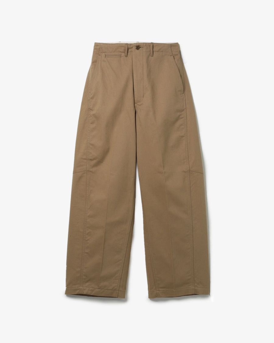 U.S. ARMYのM-43チノトラウザーズを着想源に、自然なムラ感とドライな質感をもつチノ素材で仕立てたバレルレッグパンツです。