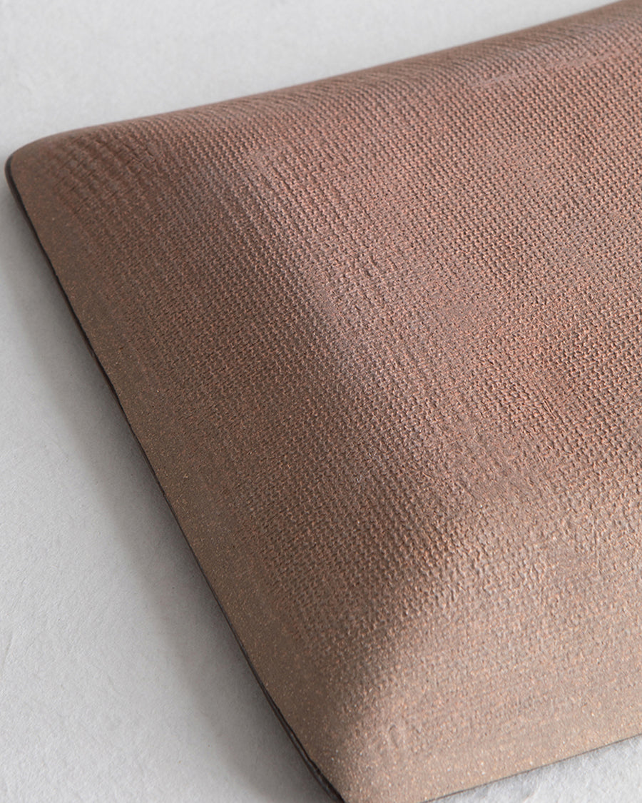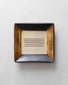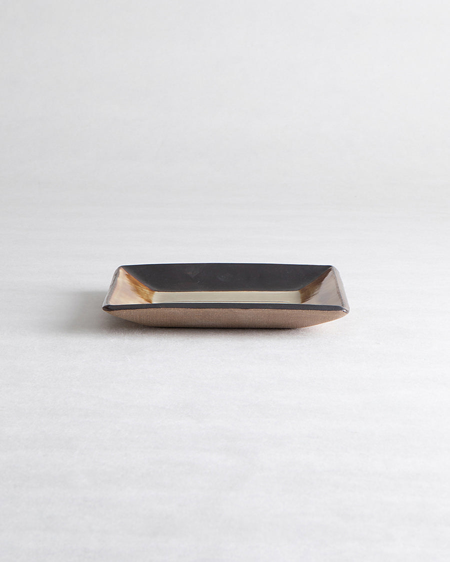 色付けのコントラストが美しい正方形の角皿です。色付け・釉薬を施した内側と素地を生かした外側とのコントラストが引き立ちます。