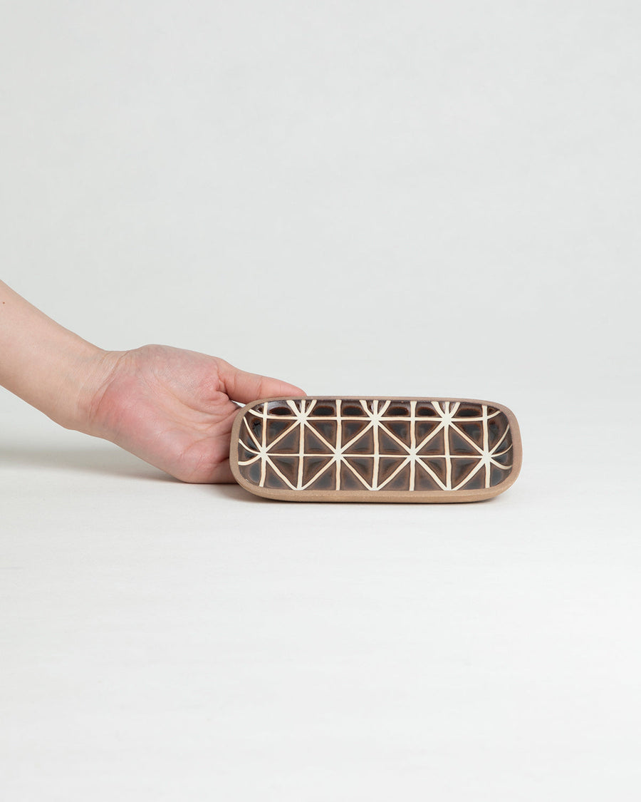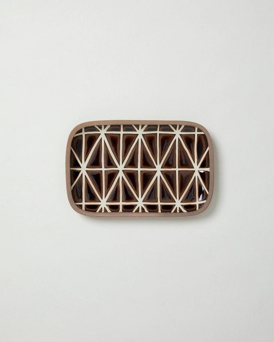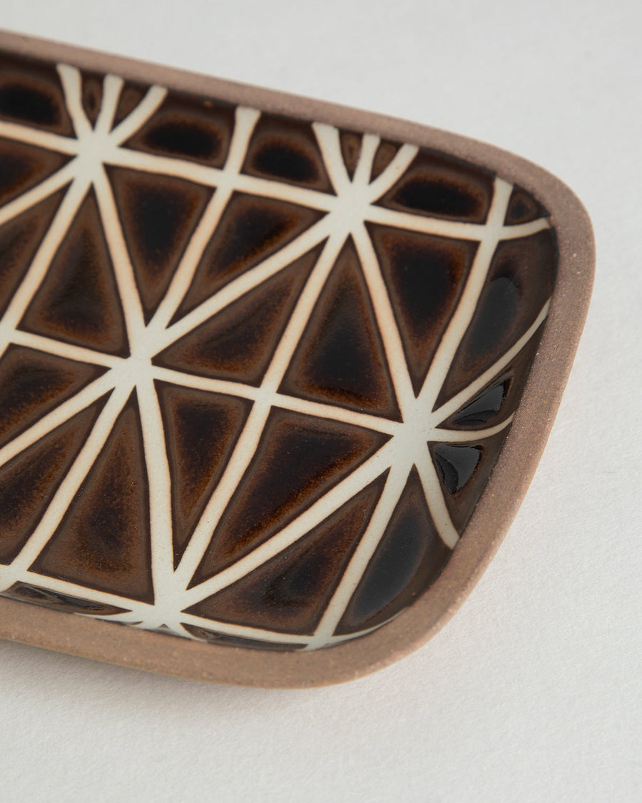 三角形を規則的に並べた模様の角皿です。