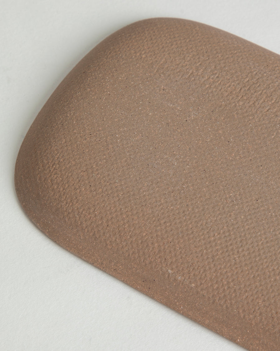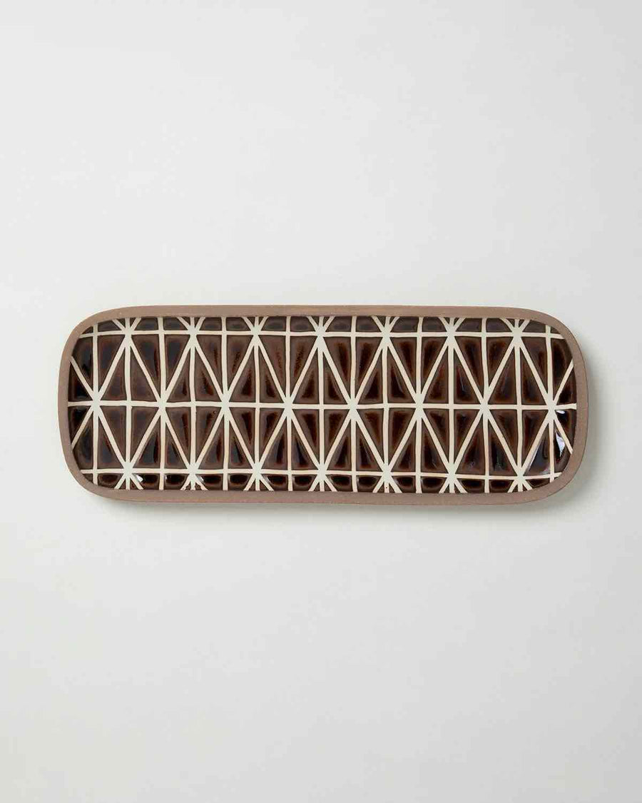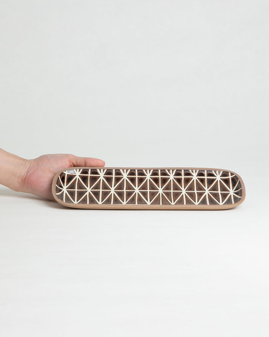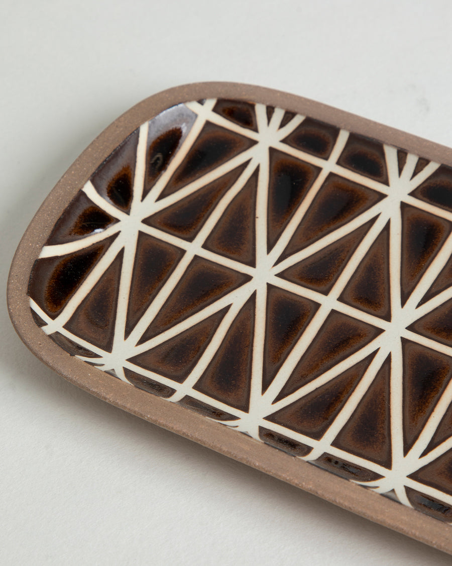 三角形を並べた模様の角皿です。色付け・釉薬を施した内側と素地を生かした外側とのコントラストが引き立ちます。