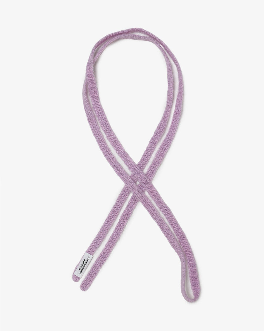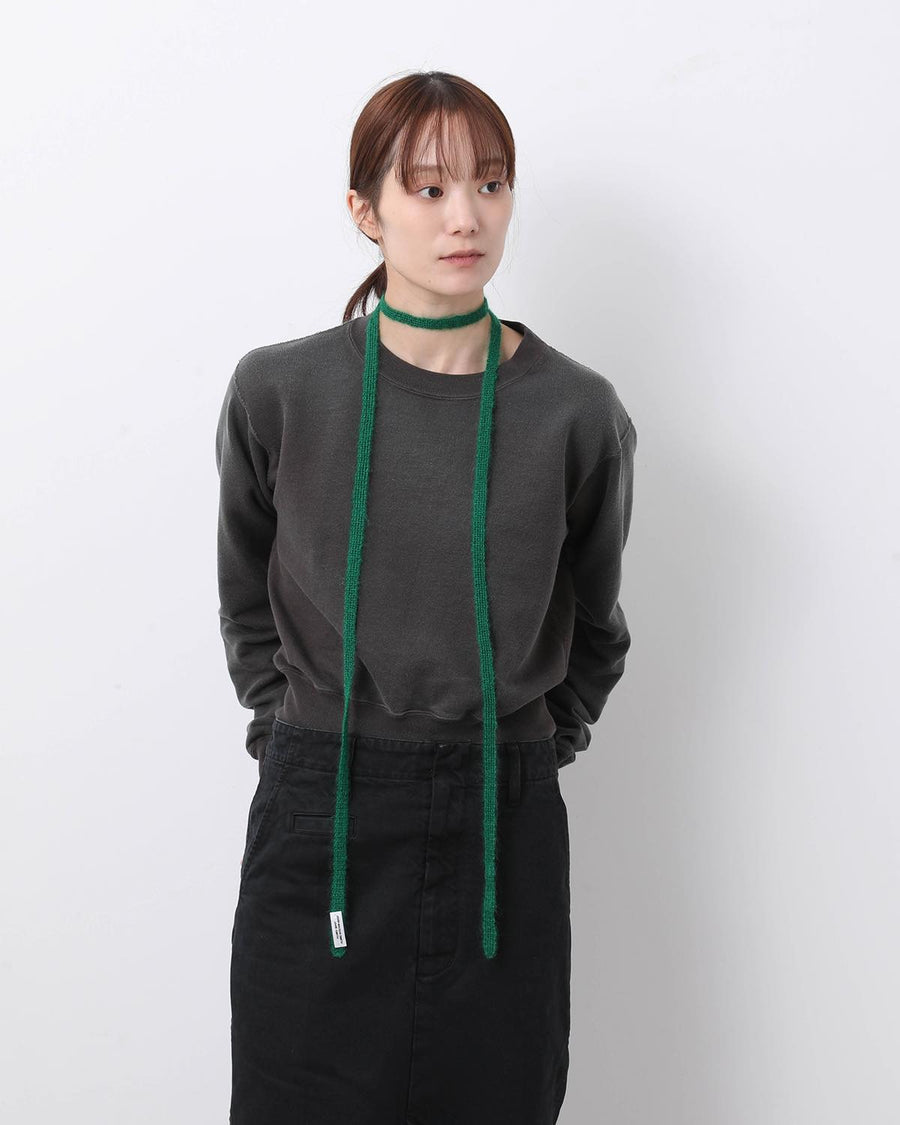 「MOHAIR RANDOM BORDER CREW KNIT for COVERCHORD」と同じロングヘアーモヘア糸をテープ状に編み立てました。