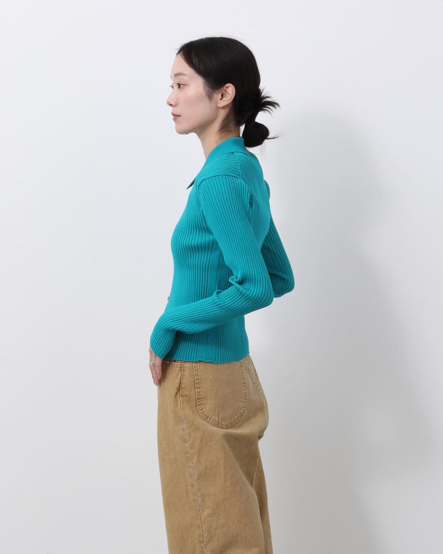 16Gの機械編みでプレーティングリブ編みを施した、リブ襟付きカーディガンです。