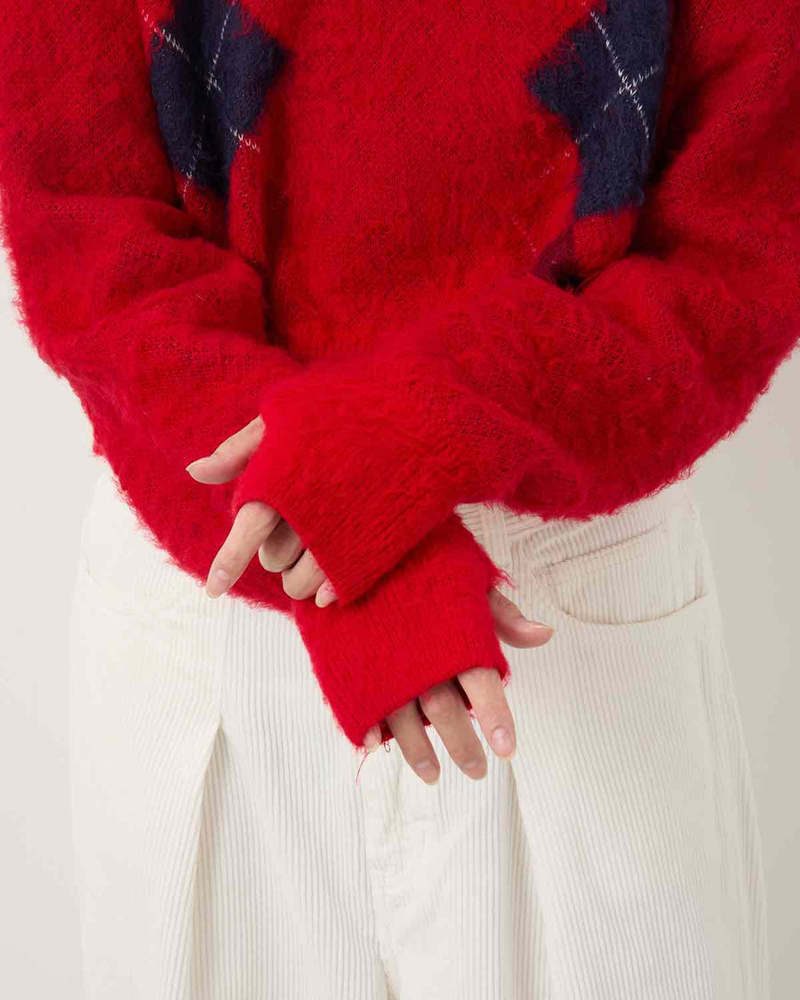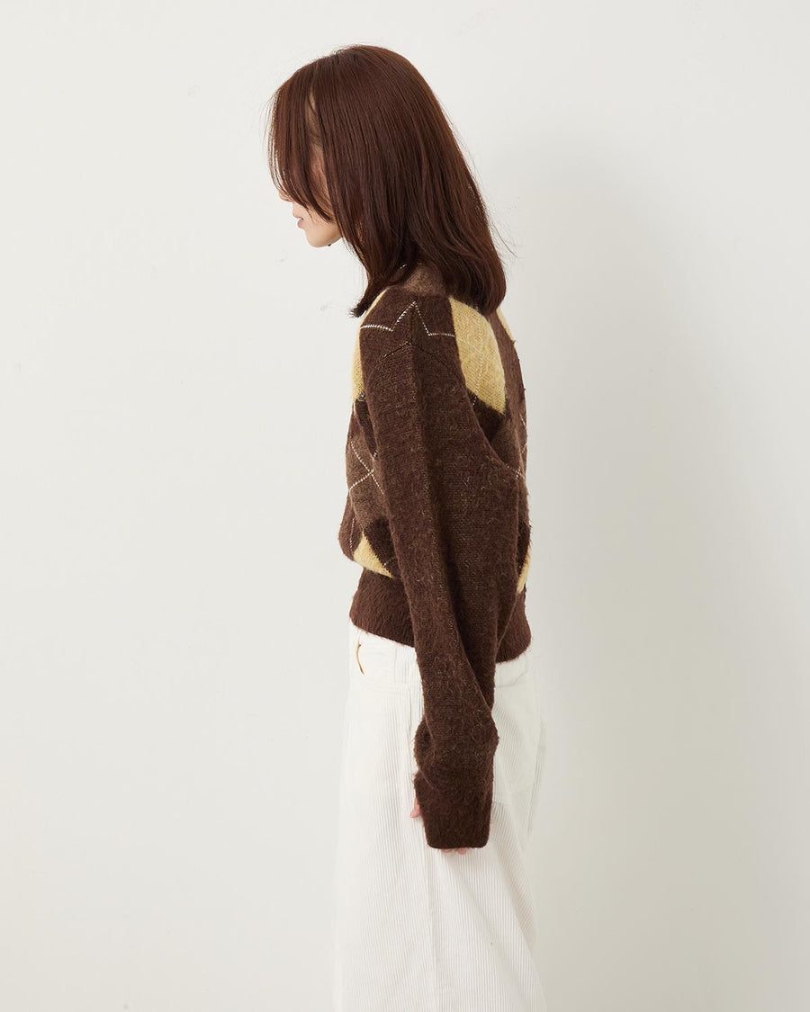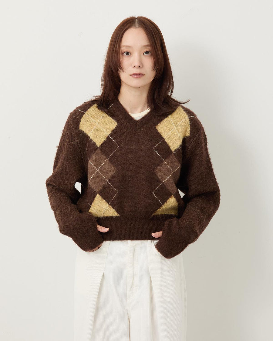 7G機械編みのダブルジャガード編みで、オリジナルのアーガイル柄を再現した、ショート丈のVネックニットです。