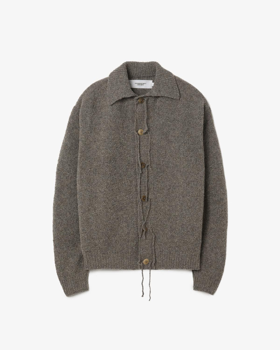 軽く膨らみのある柔らかな糸を使用し、表面に輪状の糸ループが出るように編まれた、襟付きのニットカーディガンです。
