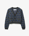 40/1のコンパクトヤーンを使用した、4色使いのジャカード織りによるショート丈Vネックカーディガンです。