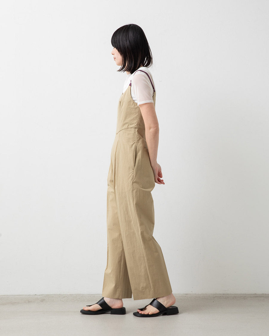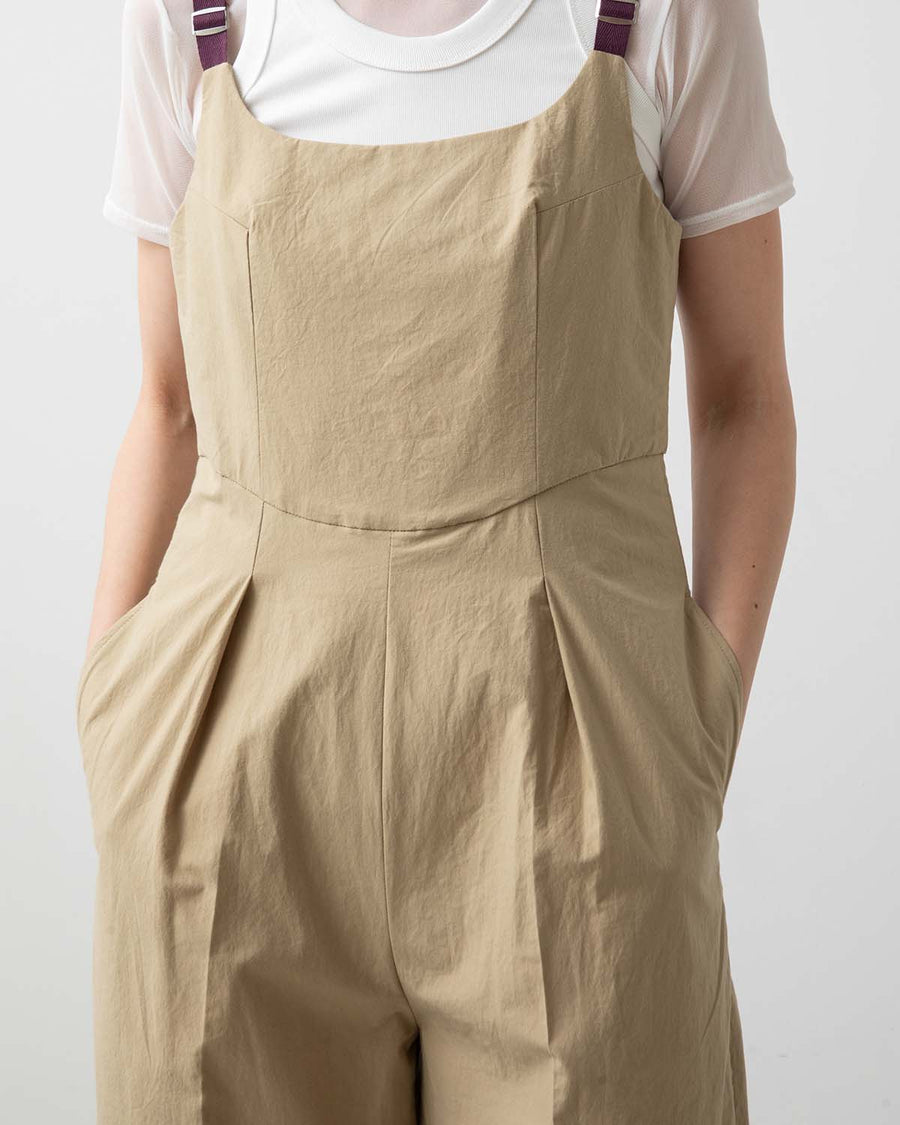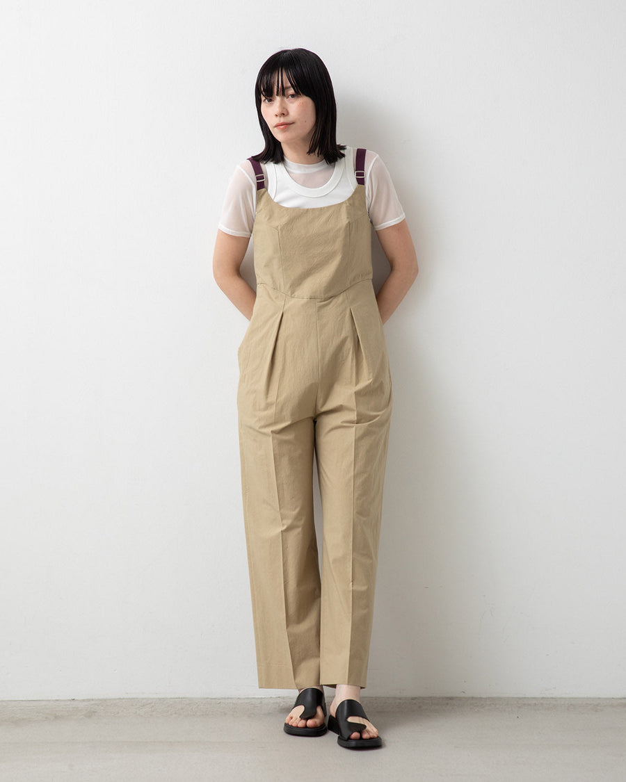 高密度で織り上げたコットンブロード生地に近江晒加工と反撥加工を施しワッシャー感と独特のコシを表現したオールインワンです。